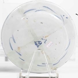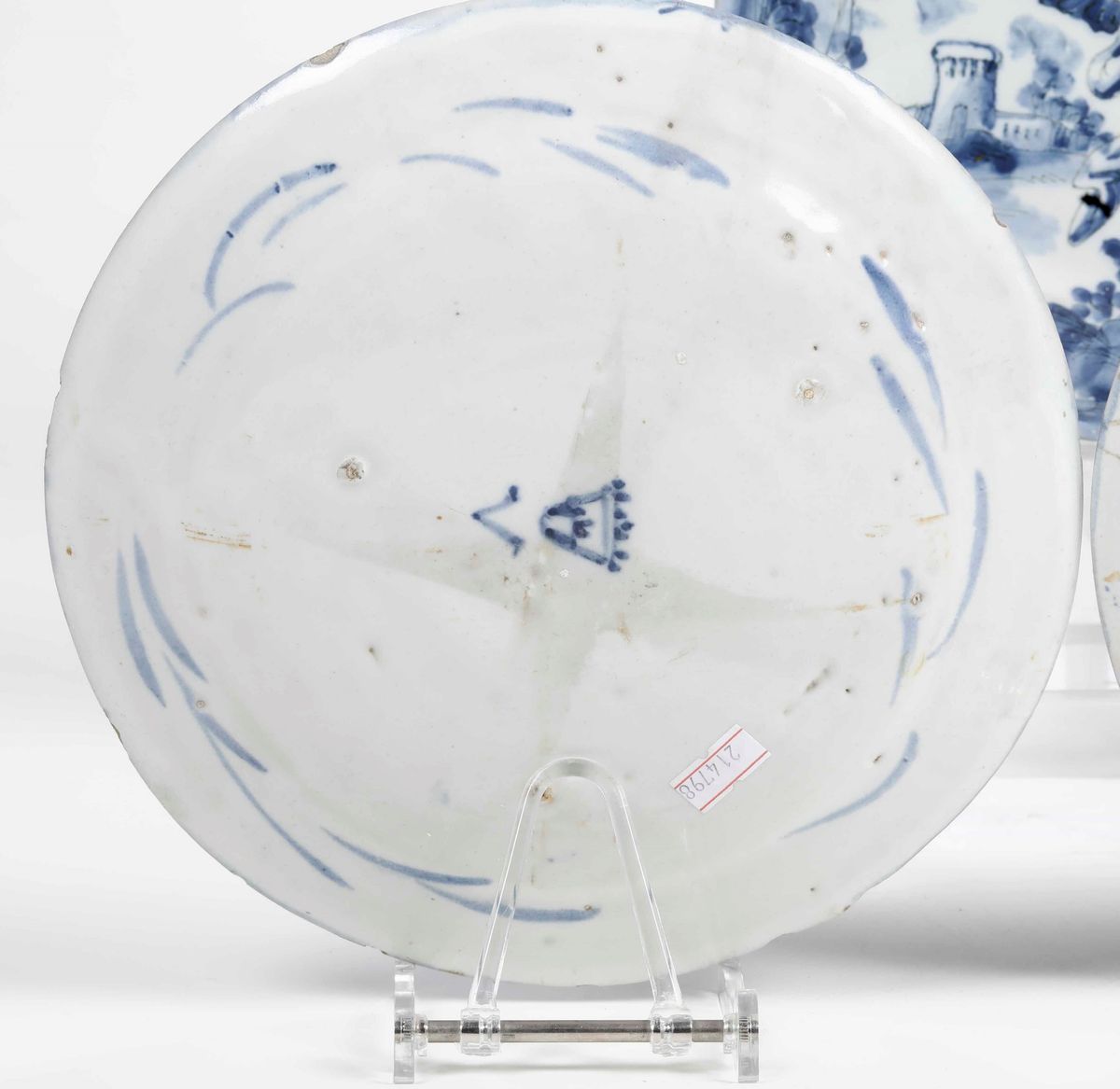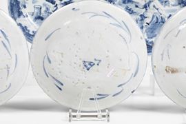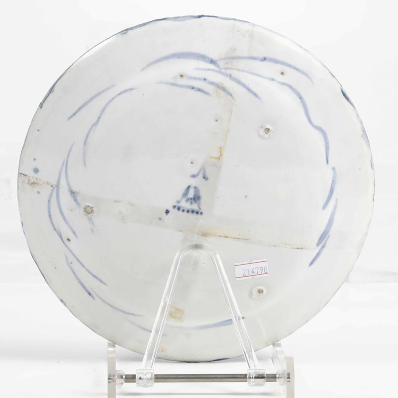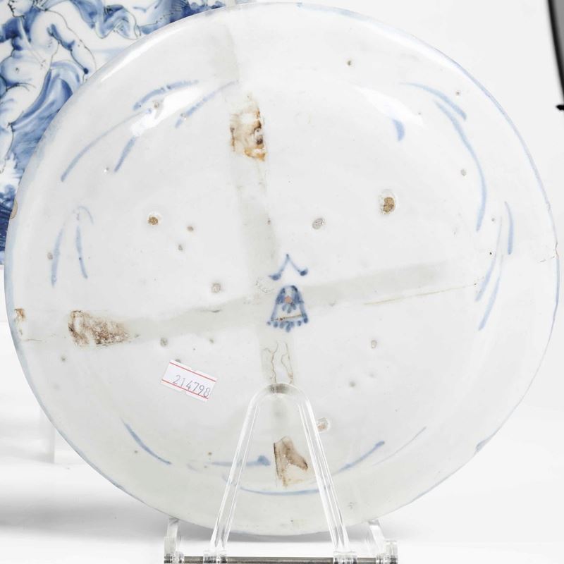 Maiolica monocroma blu di cobalto a gran fuoco. Marca:stemma di Savona e lettera “V” in blu o in manganese. Dimensioni: diametro cm 23,5. Conservazione: quattro piatti in ottimo stato con qualche sbeccatura al bordo; due piatti con sbeccatura integrata al bordo