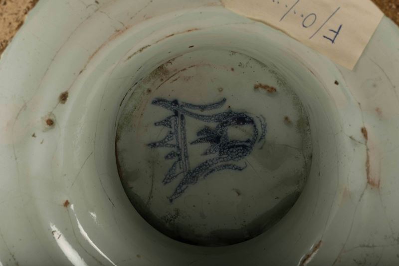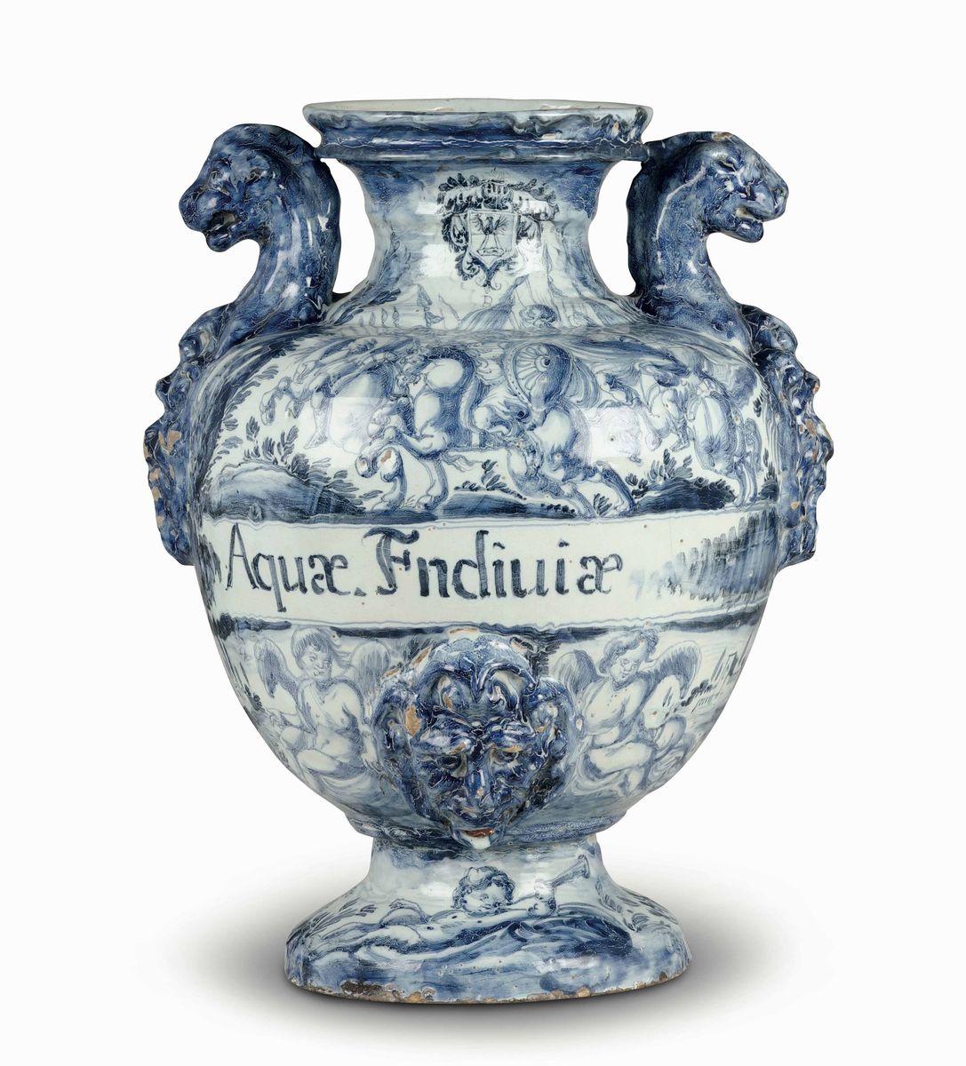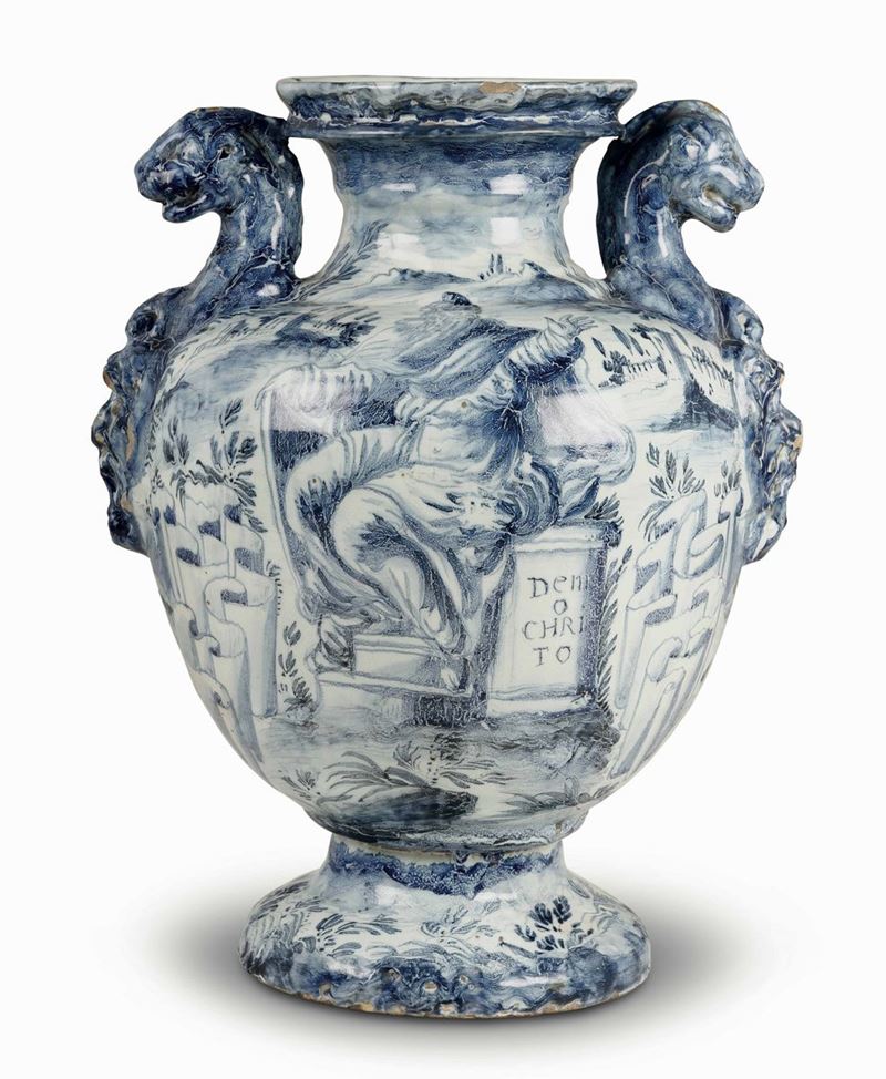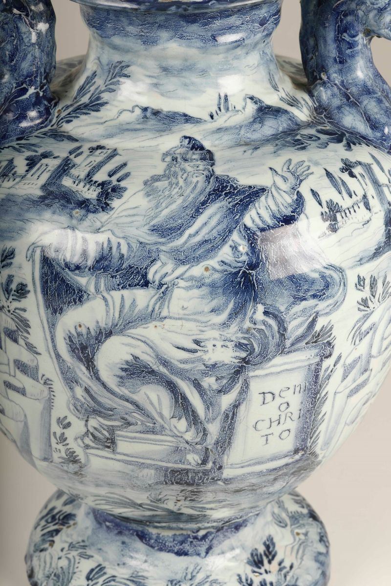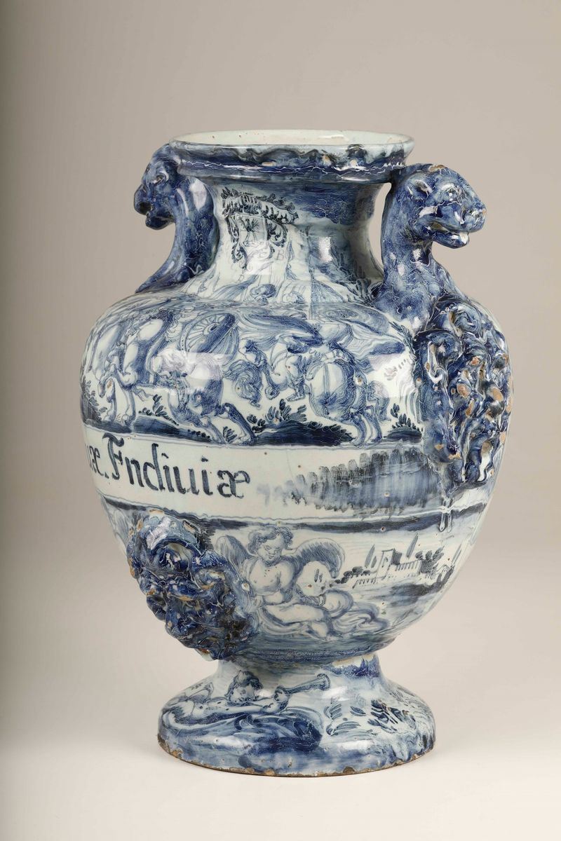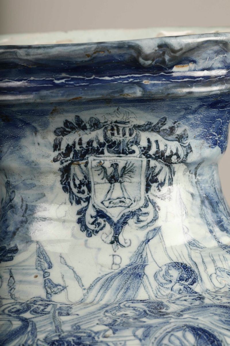 Maiolica a gran fuoco in monocromia blu di cobalto. Marca: stemma di Savona in blu. Altezza cm 44,5. Minime insignificanti sbeccature
