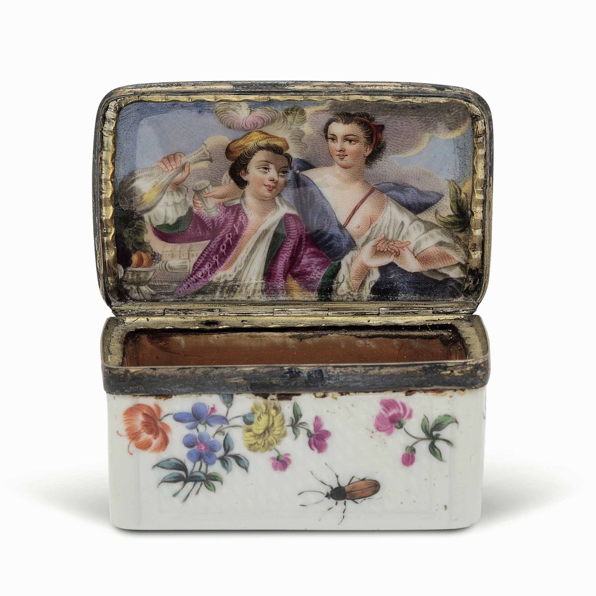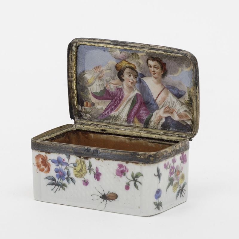 Il nostro esemplare è decorato in policromia, esternamente con ramoscelli fioriti e fogliati ed insetti posti in odine sparso. L’interno è dorato e il coperchio ospita una giovane coppia galante ripresa da un dipinto di Jean-Marc Nattier (1685-1766) già riprodotto su tabacchiere di Meissen nel terzo quarto del XVIII secolo