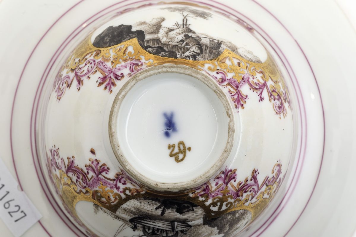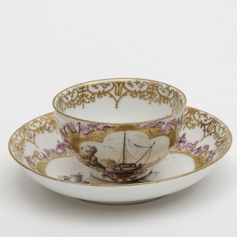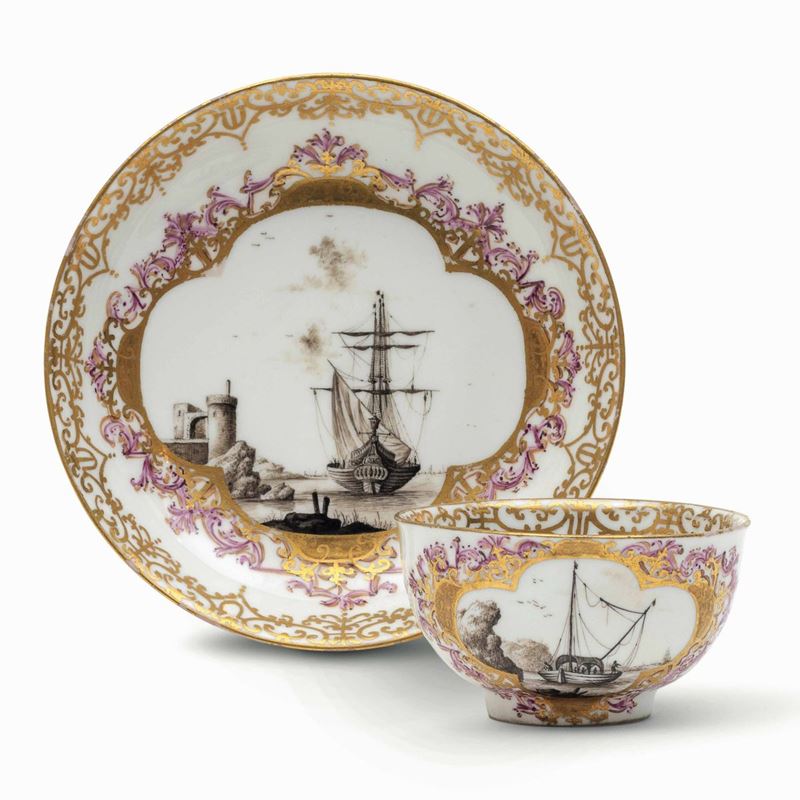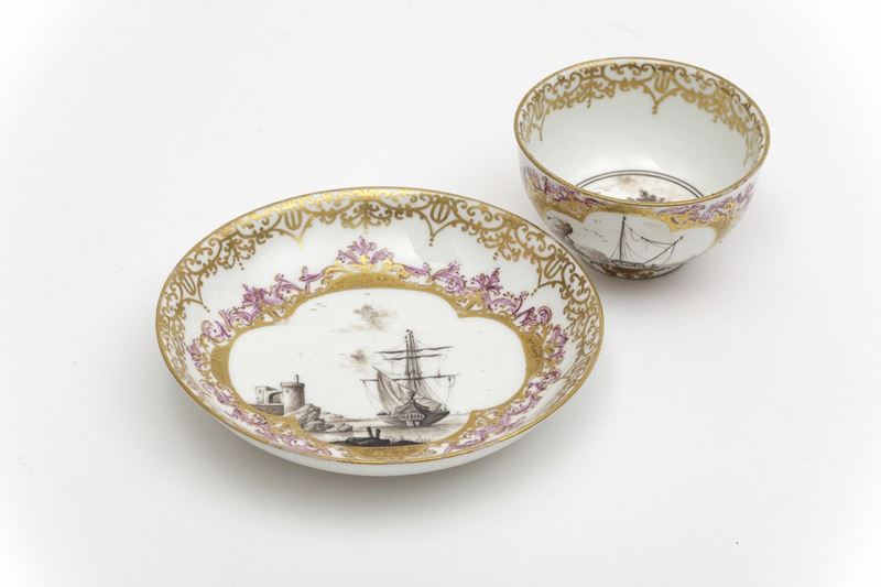 La tazza, a forma di “bol”, è decorata con due scene di rive selvagge in monocromia “Schwarzlot” racchiuse in medaglioni quadrilobati incorniciati da un ricco “Laub- und Bandelwerk” e, all’interno della tazza, una scena di genere in un doppio cerchio. Il piattino ospita una scena marinara con grande galeone racchiuso in una riserva quadrilobata. Ai bordi, sia della tazza che del piattino, ricca bordura detta “Goldspitzendekor” in porpora, oro e lustro di Böttger