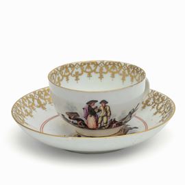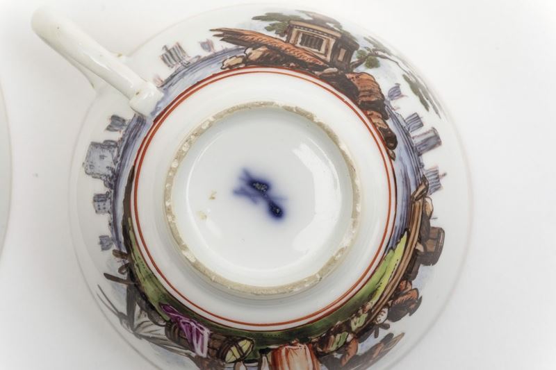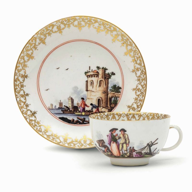 La tazza con il manico ad orecchio è decorata con una scena di commercio marittimo senza soluzione di continuità. Anche il piattino è dipinto in policromia con una scena della stessa tipologia incorniciata da un doppio cerchio rosso ferro. Agli orli interni ricca bordura in oro detta “Goldspitzendekor”