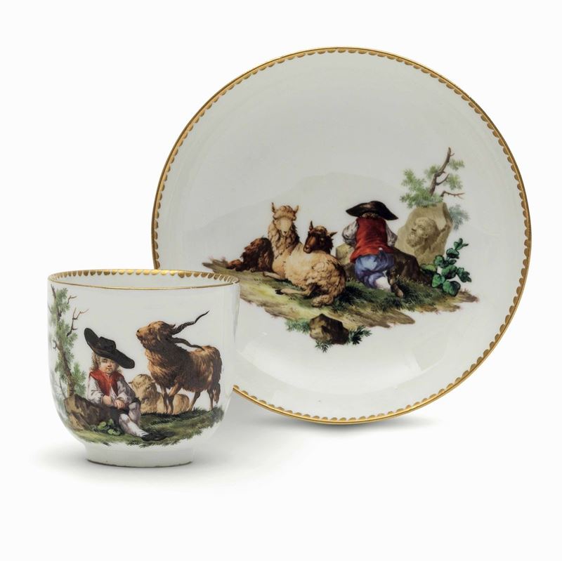 La tazza e il piattino sono dipinti con scene bucoliche che vedono raffigurato un pastorello con gregge al pascolo, in postura frontale sulla tazzina, mentre sul piattino è raffigurato di spalle, nell’atto di osservare un’effige classica scolpita sul masso che gli sta a lato. L’elegante manico, modellato a vegetale, è lumeggiato in azzurro e oro. Pure in oro è il motivo a “dente di lupo” che profila gli orli