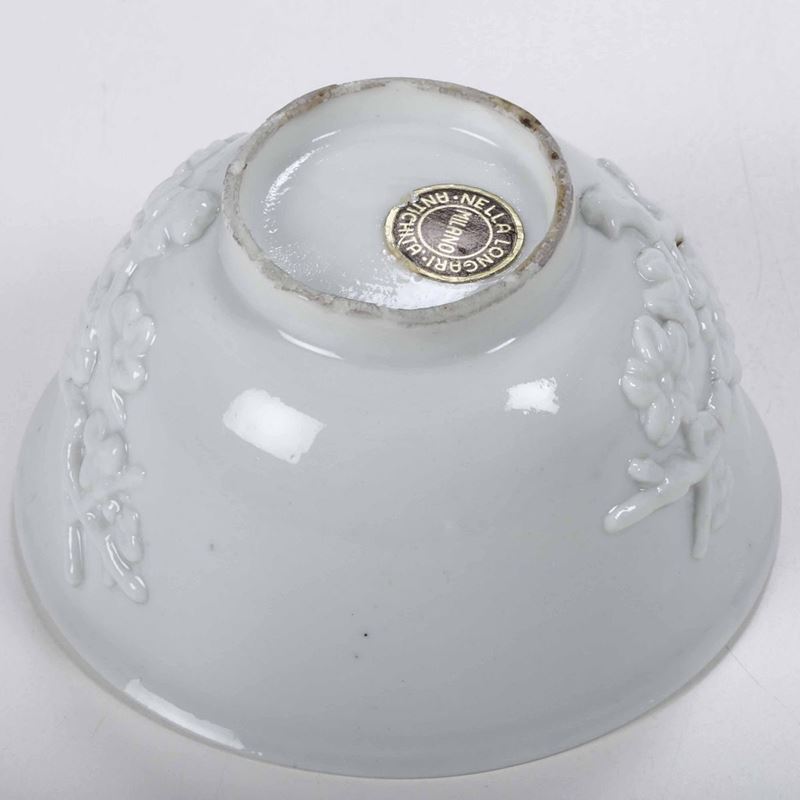 La tazza a ciotola senza piattino è decorata con rametti di fiori di pruno in rilievo ripresi da prototipi cinesi. Questa motivo definito negli elenchi della manifattura “bianco con rilievi di fiori e foglie” fu uno dei primi utilizzato a Doccia. Le caratteristiche imperfezioni di questa porcellana ci suggeriscono che si tratta di pezzo prodotto in un periodo ancora sperimentale