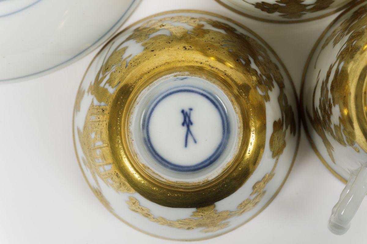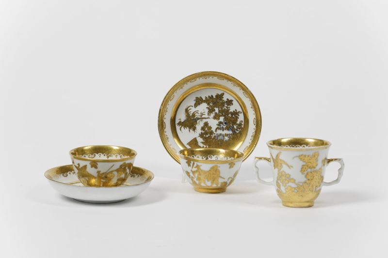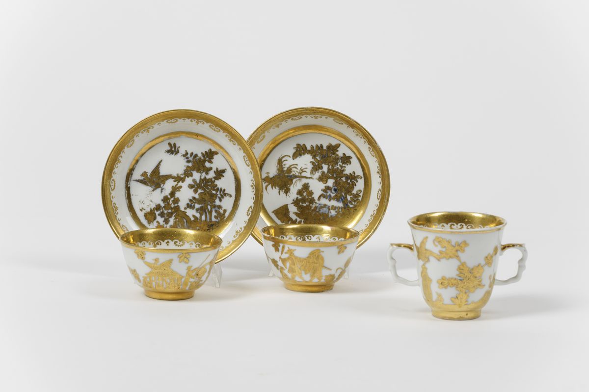 Tre tazze con due piattini Meissen, 1730 circa (porcellana) Augsburg, bottega dei Seuter, 1730-1735 circa (decorazione in oro)