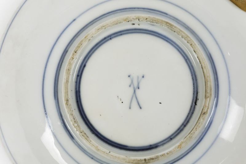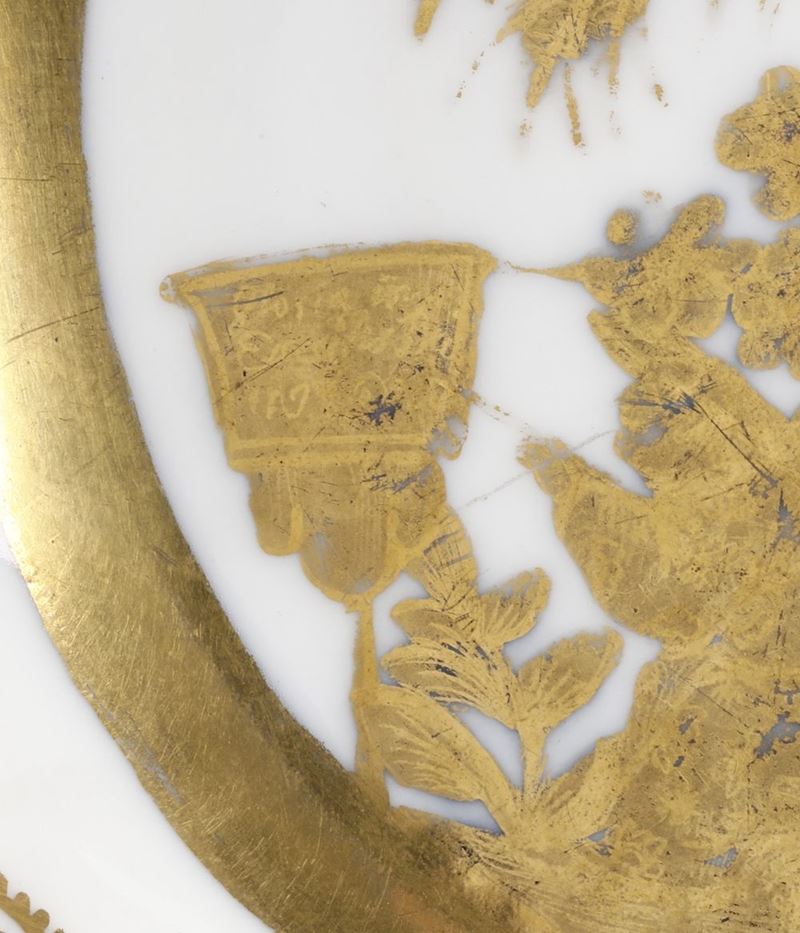 Queste porcellane sono state decorate dapprima in blu a gran fuoco presso la manifattura di Meissen, con il motivo detto “Fels- und Vogeldekor” ispirato da motivi orientali: ossia rocce da cui fuoriescono rami di pruno e un uccello in volo. In seguito sono stati dipinti in oro “radiert” a cineserie animate presso la bottega Seuter di Augsburg