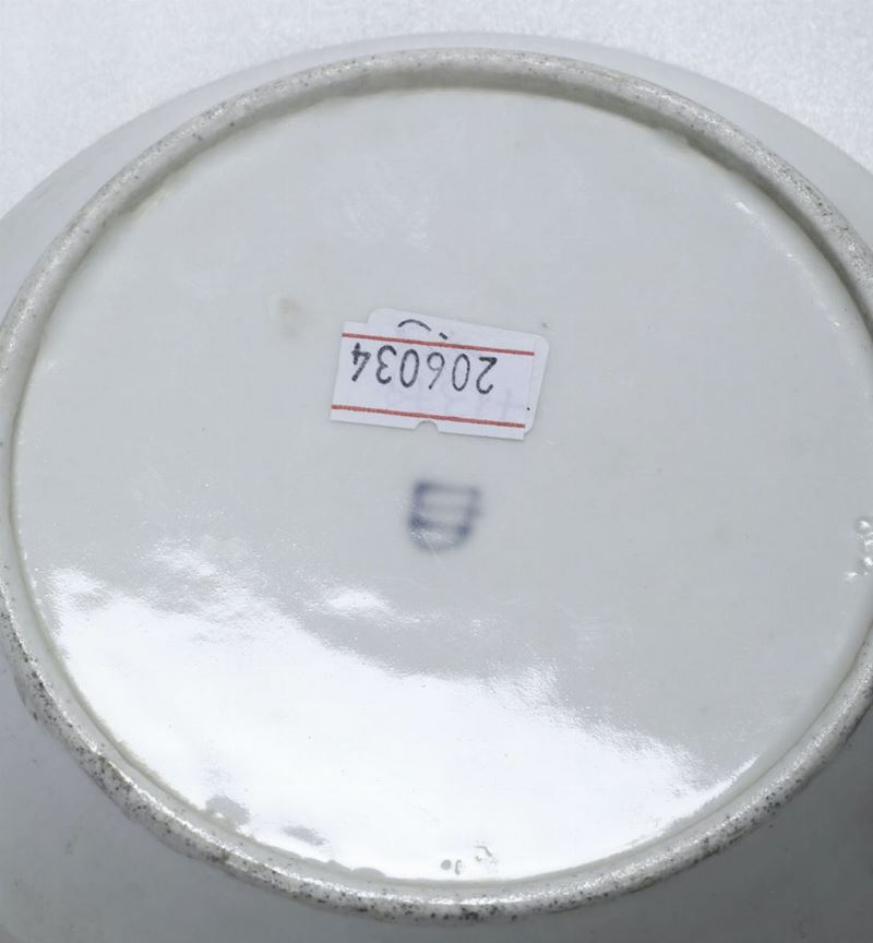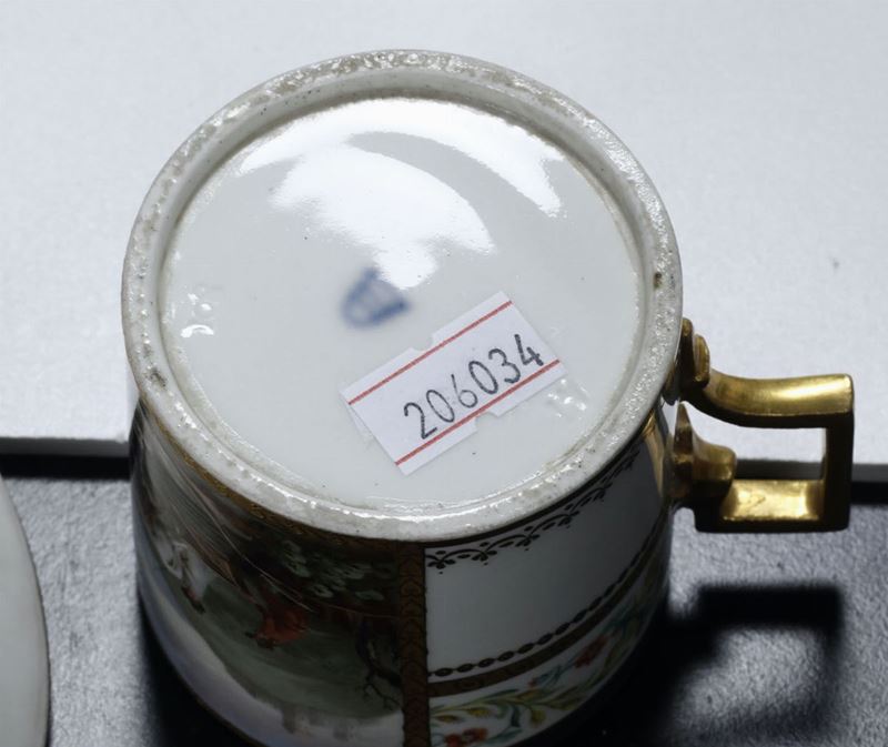 Porcellana policroma. Marca: scudo blu; numeri diversi impressi tra cui 801 sulla tazza e 802 sul piattino. Altezza tazza cm 6,2; diametro piattino cm 13,4. Conservazione: perfetta