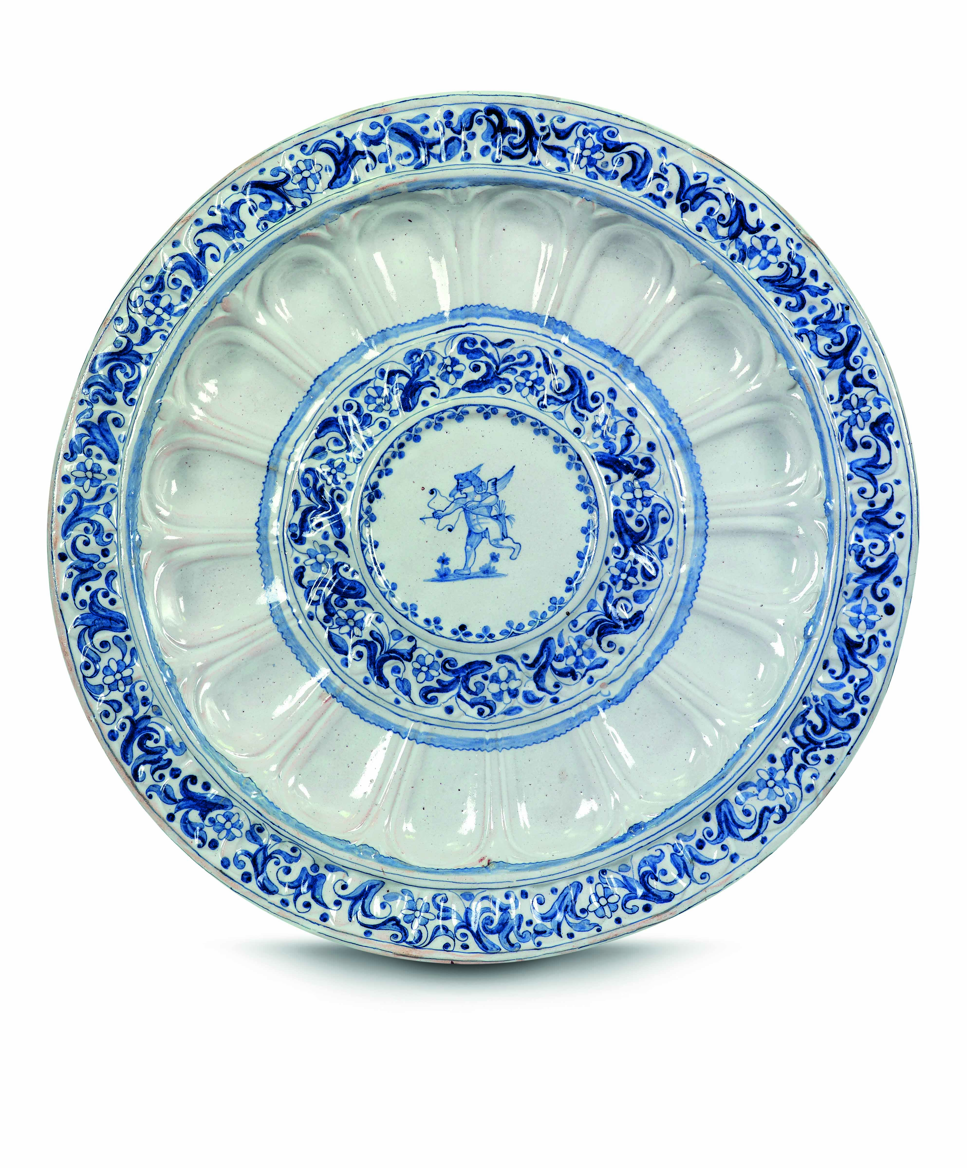 Questo bacile “da acquereccia”, eseguito a stampo, ha fondo e tesa baccellati e l’umbone col bordo rialzato decorato con un putto alato che raffigura “Amor cieco” armato di arco, faretra e frecce incorniciato da due fasce concentriche con motivi vegetali stilizzati