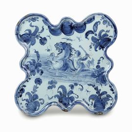 Il vassoio quadrato, dal bordo fortemente polilobato, poggia su quattro piedini. La decorazione, del tipo “a tappezzeria”, in blu su fondo berettino, vede al centro un putto a cavallo di un mostro marino con testa leonina, corpo equino e coda di delfino, mentre dai lobi fuoriescono da rocce ciuffi d’erba con fiori. Inoltre insetti in volo