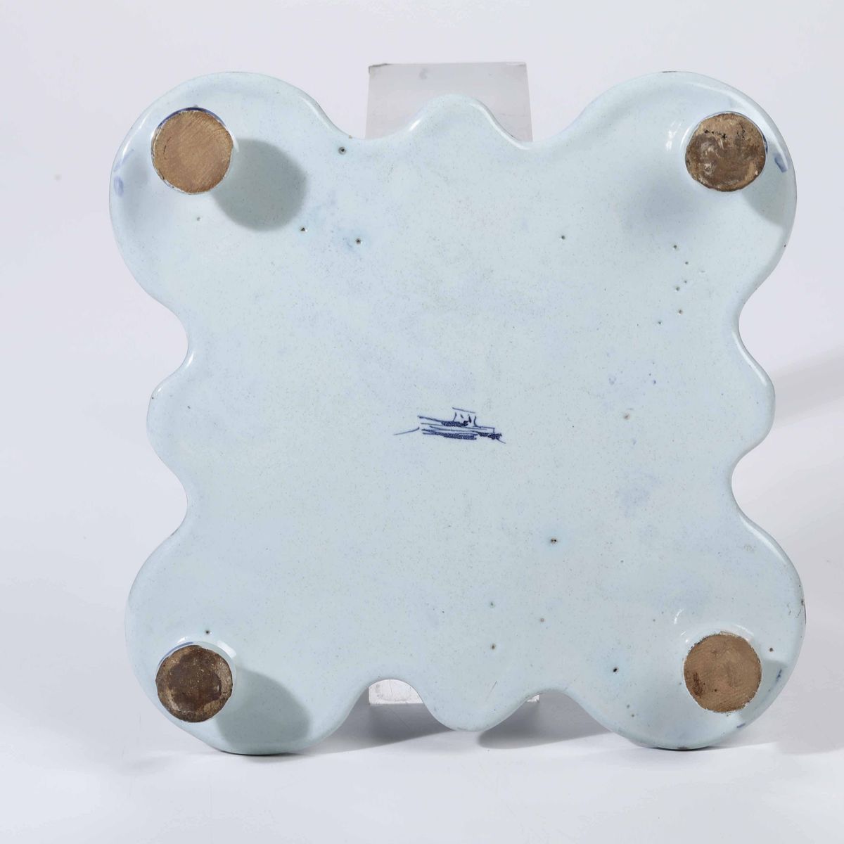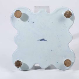 Maiolica in monocromia blu di cobalto a gran fuoco. Marca: fortezza in blu. Altezza cm 4 circa; cm 24x24. Conservazione: ottima; piccole sbeccature al bordo