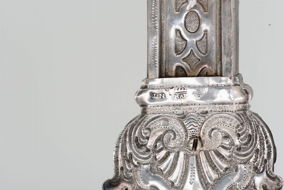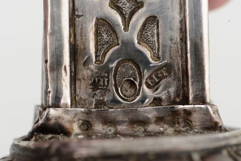 Molten, embossed and chiselled silver. City guarantee mark with faded date, unidentified assayer's mark and mark attributed to goldsmith Nicola Treglia