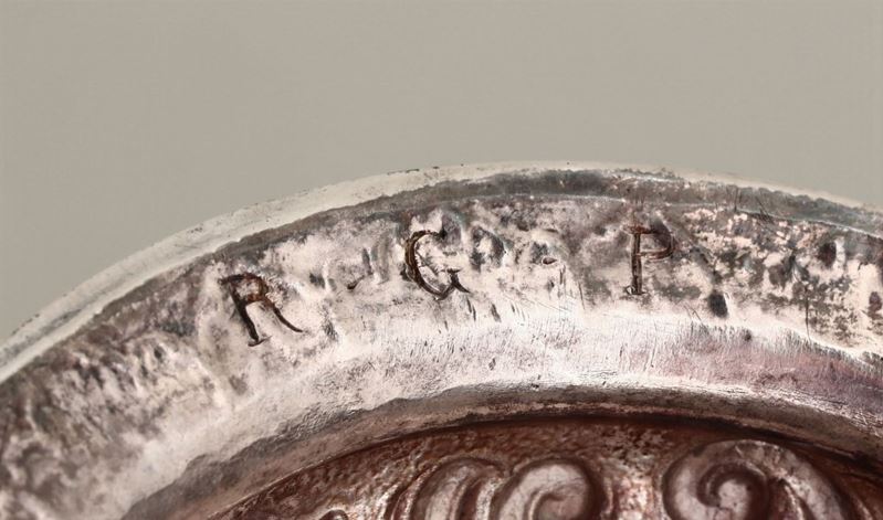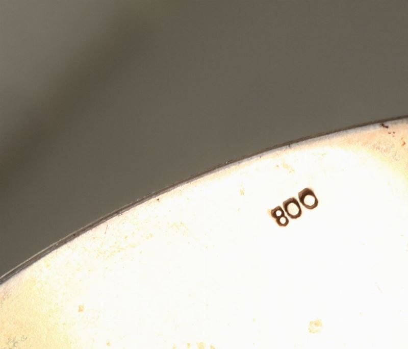 Embossed and chiselled silver. Undated Torretta stamp and mark 800 on the paten (not coeval). Chalice H 22cm and 360gr, paten (20th century) 125gr, diam 15cm