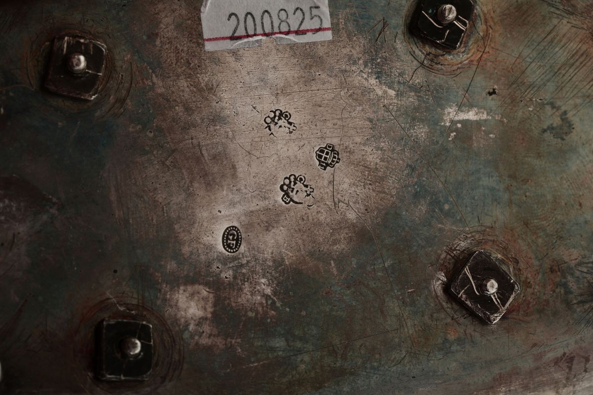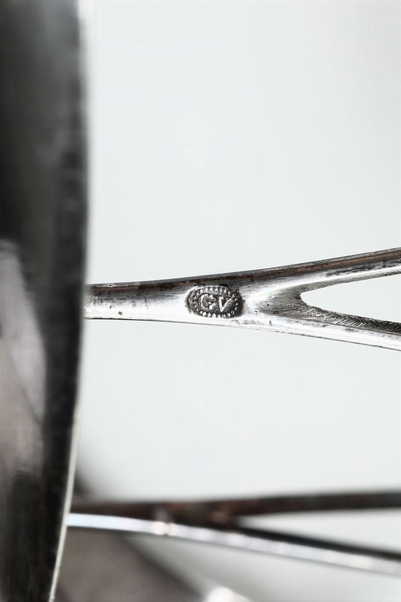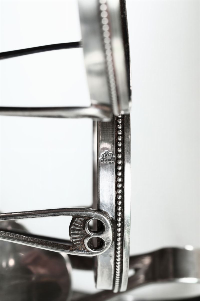 Molten and embossed silver and glass. Guarantee marks in use from January 1815 to July 1824, hallmarks for silversmith Giuseppe Balbino (…1775 – 1814…) and assayers Giuseppe Fontana (…1787 – 1815…) and Giuseppe Vernoni (…1778 – 1824). 28x10x13cm, 380gr