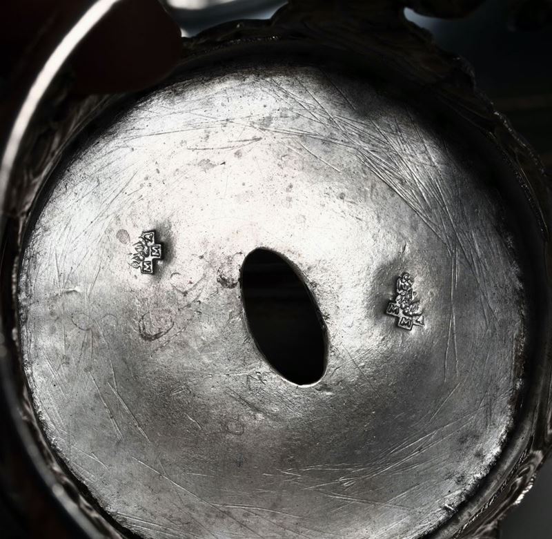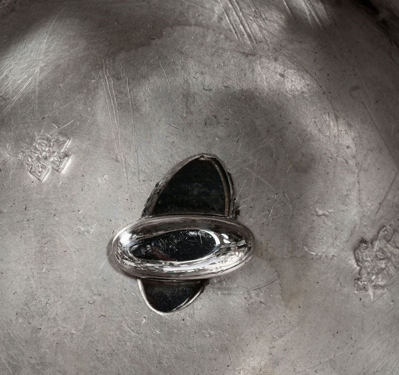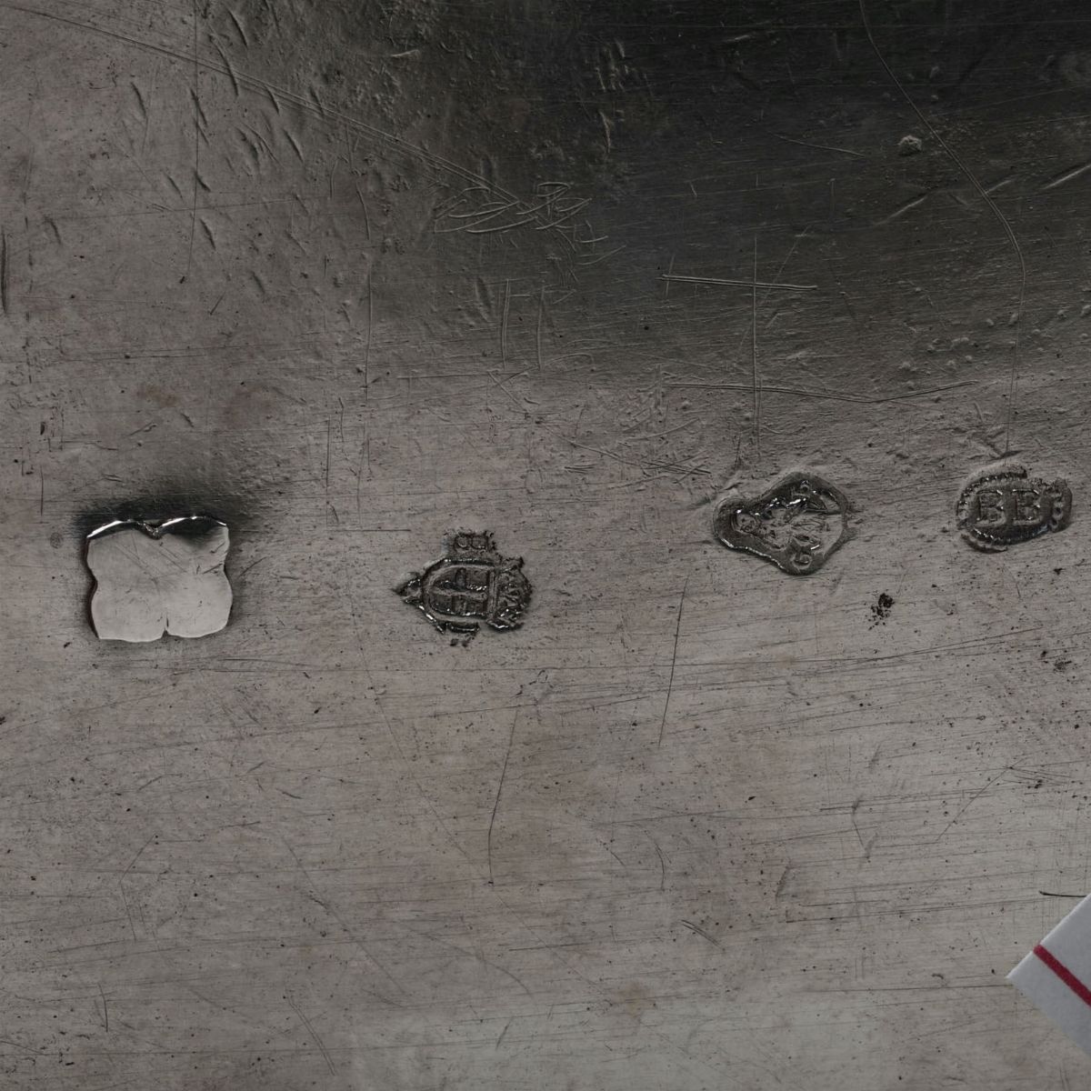 An oil and vinegar cruet in embossed, chiselled and perforated silver and glass. Guarantee marks for assayer Bartolomeo Bernardi (…1779-1816), silversmith's stamp for Giovanni Battista Novalese (1783-1802) and an unidentified stamp. Base 26x14cm, cruets H 25cm, 420gr