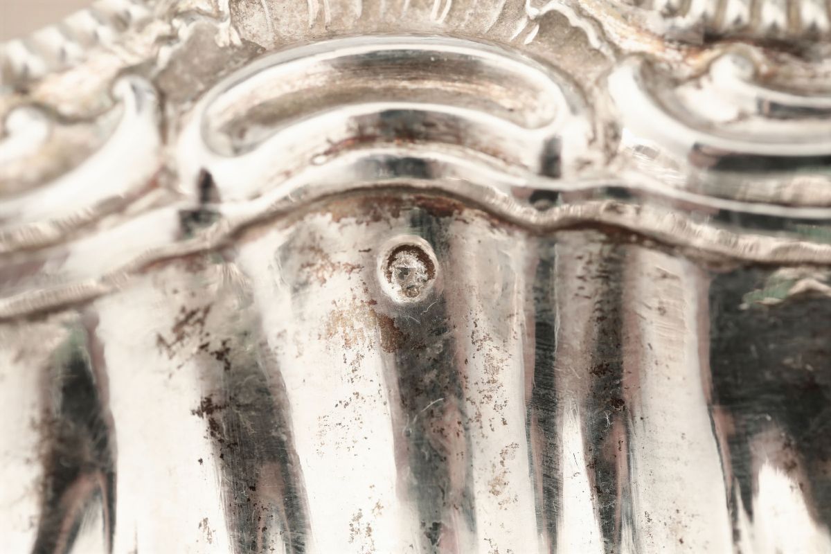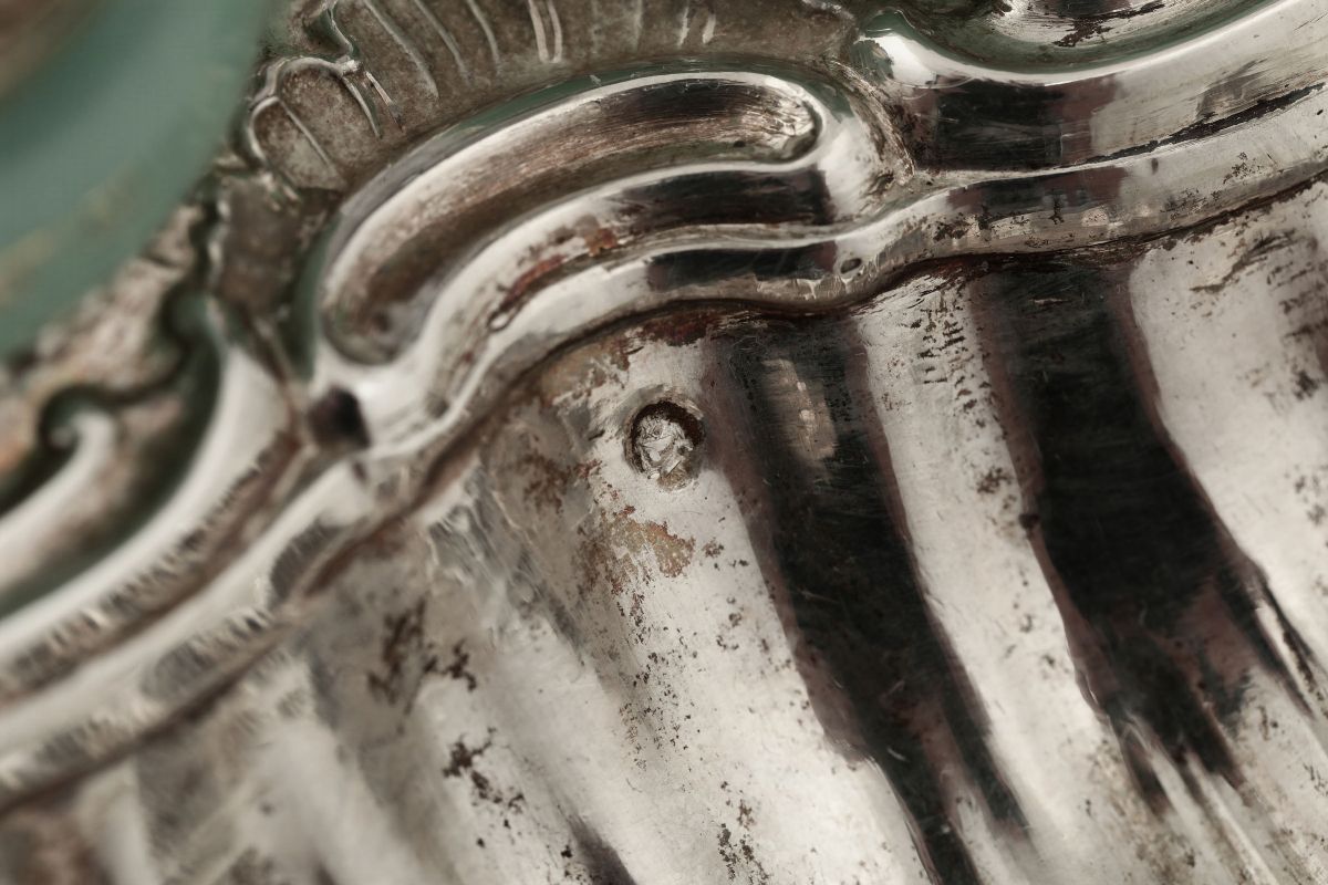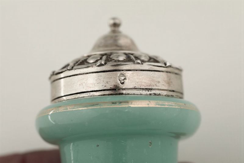 Molten, embossed and chiselled silver and coloured opaline glass. Title stamps. 15x14x7.5cm