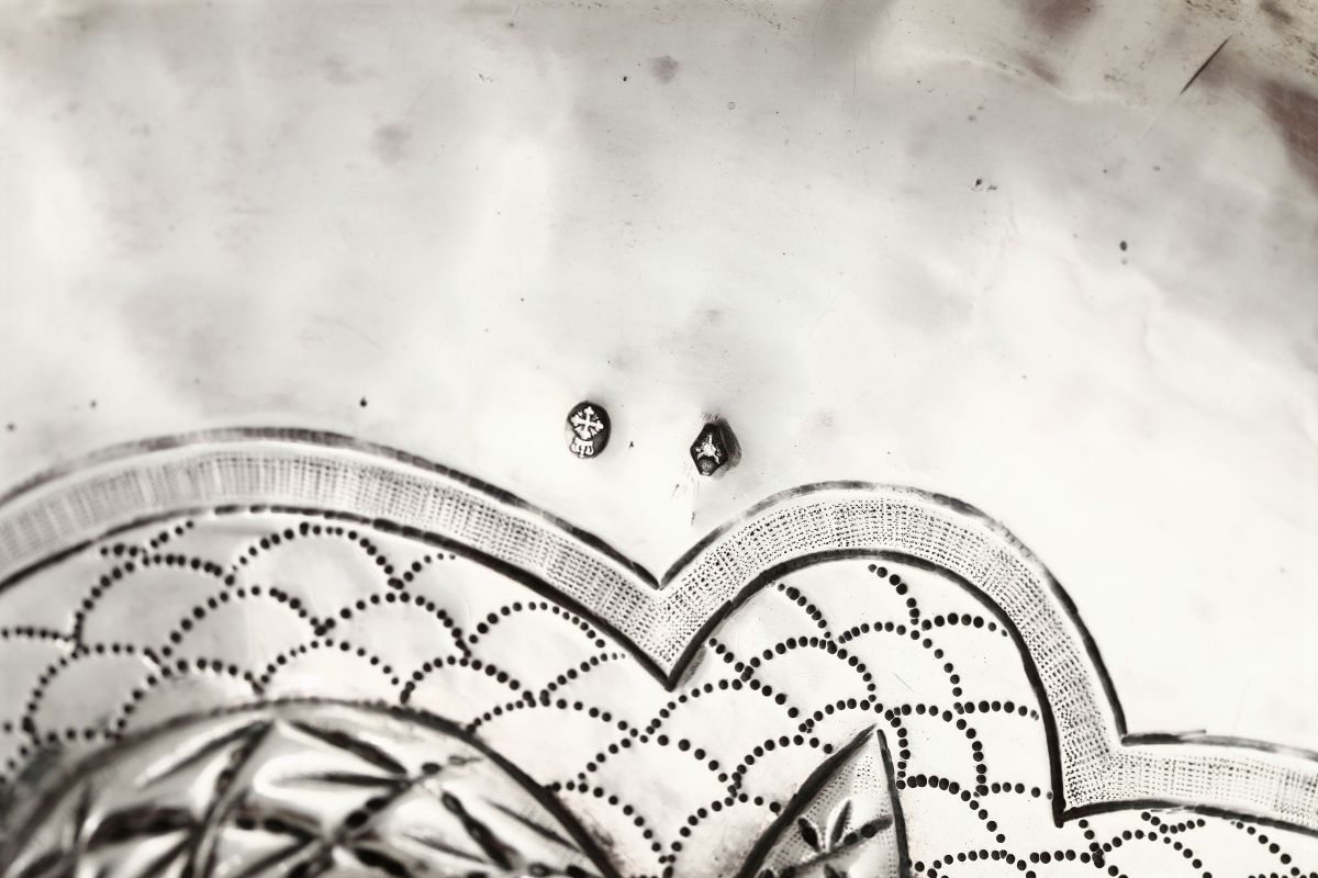 Embossed and chiselled silver. City's stamp and guarantee mark. 610gr, diam. 42.5cm