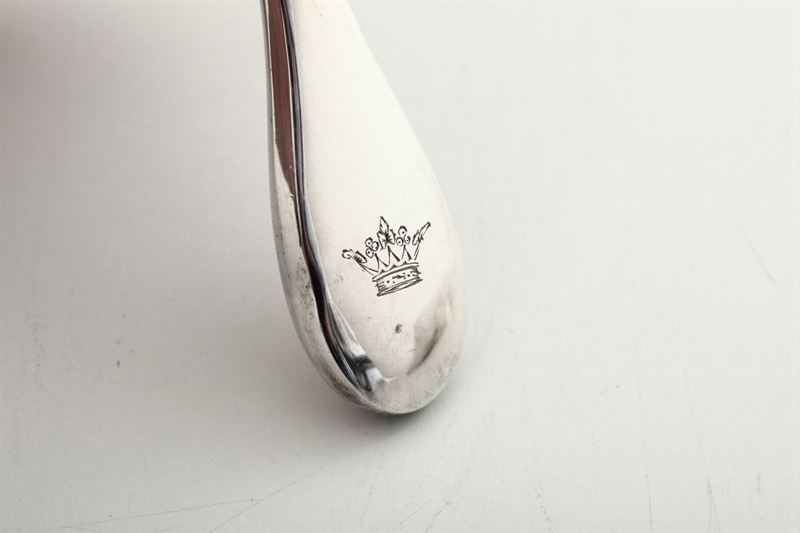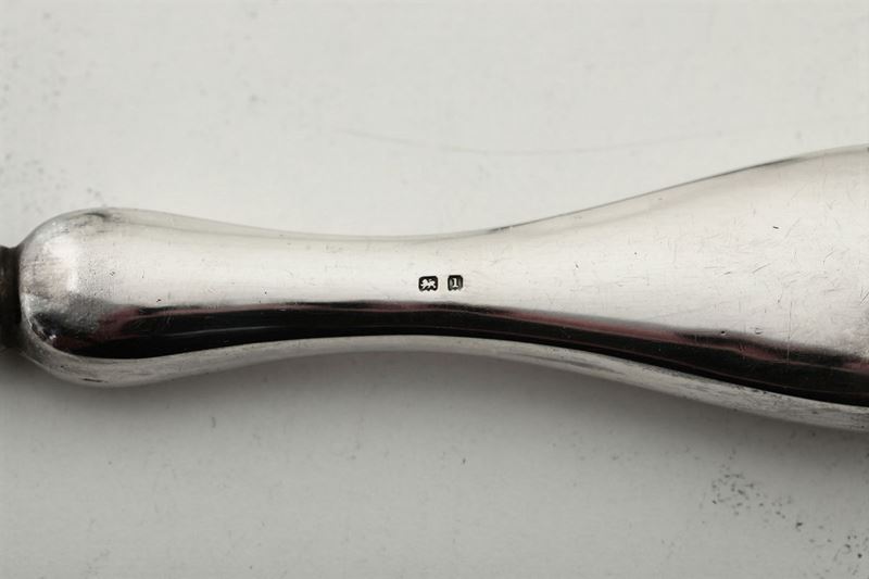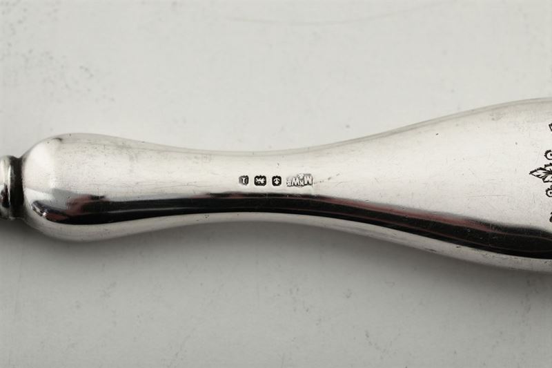 A leather case containing 19 items in silver and glass. Silversmith Mappin & Webb and other unidentified silversmith.