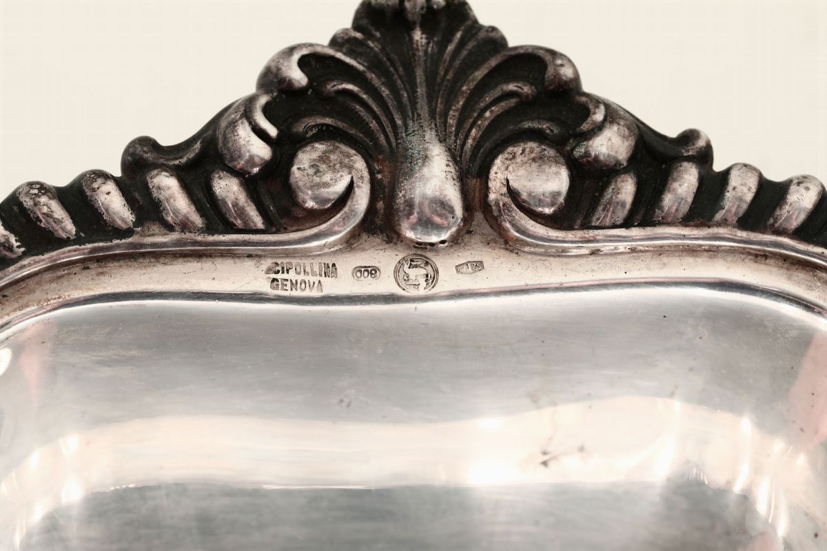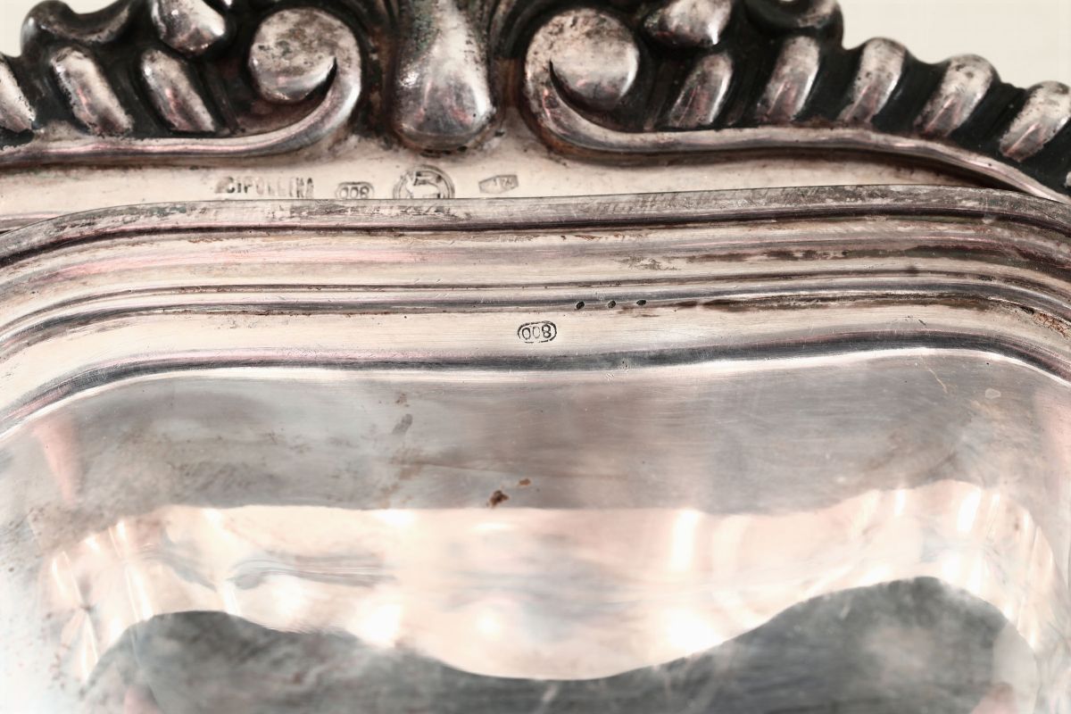 MOlten and chiselled silver. Silversmith Messulam Milano for Cipollina Genova. Title stamps with fasces in use from 1935 to 1945. diam 30cm, 1300gr