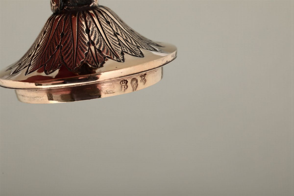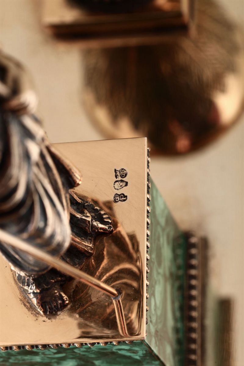 Molten, embossed, perforated, engraved and gilt silver and malachite. Stamps not relevant. 37x16x23cm