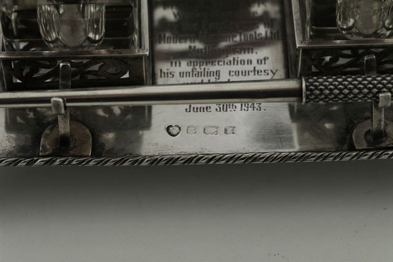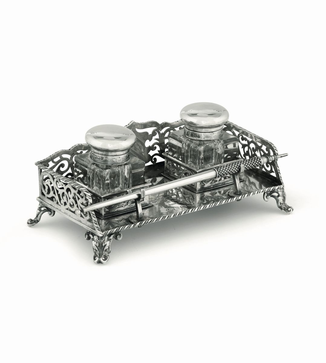 Molten, embossed and chiselled silver. Glass ink bottles. 290gr, 17x9x7cm