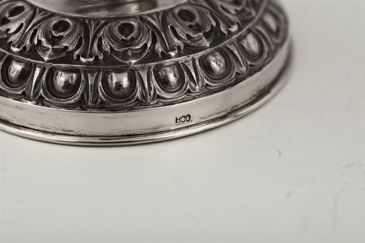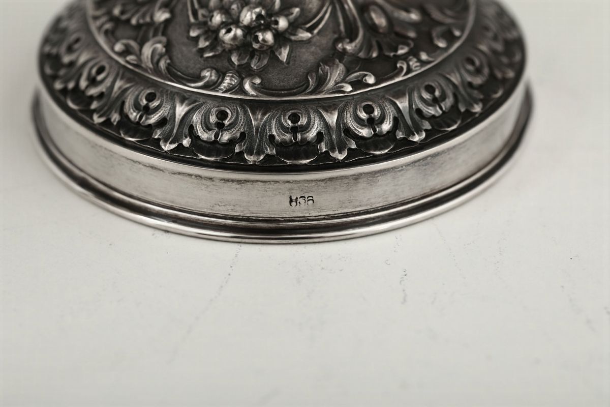 Molten and chiselled silver. 610gr, H 21cm and 19.5cm