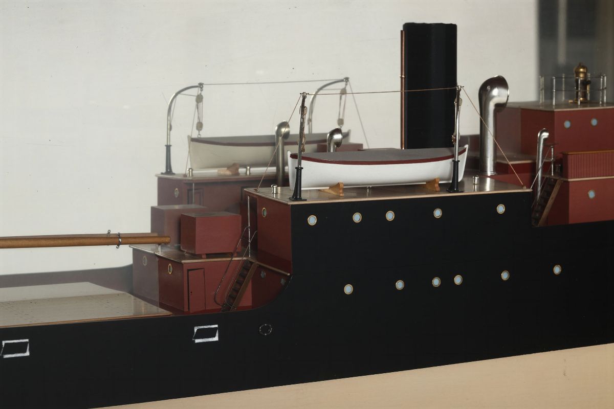 Prua dritta, poppa rotonda con elica. Opera viva rosa, opera morta nera. Cassero centrale con tuga e plancia di comando, scialuppa di salvataggio. Teca di legno e vetro, cm 51x190,5x25,5