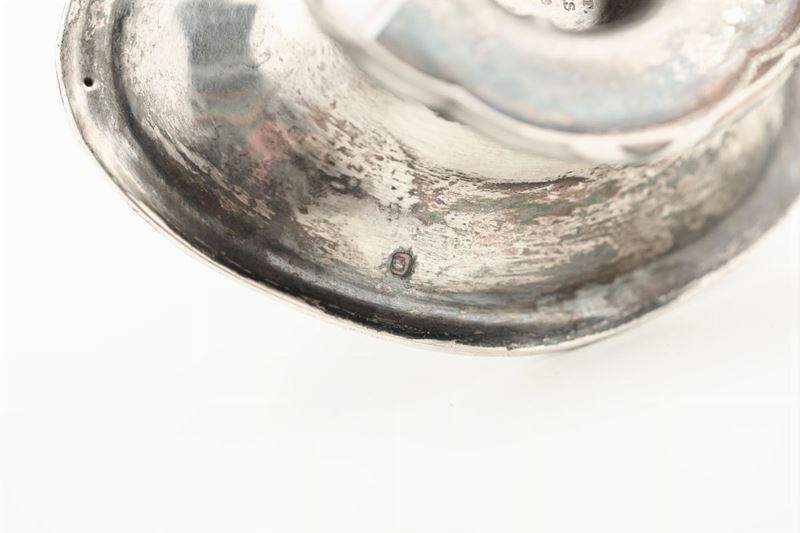 Molten and chiselled first title silver. The lot also includes an oval frame and a bronze satyr. Salt shaker 120gr, h 9.5 cm