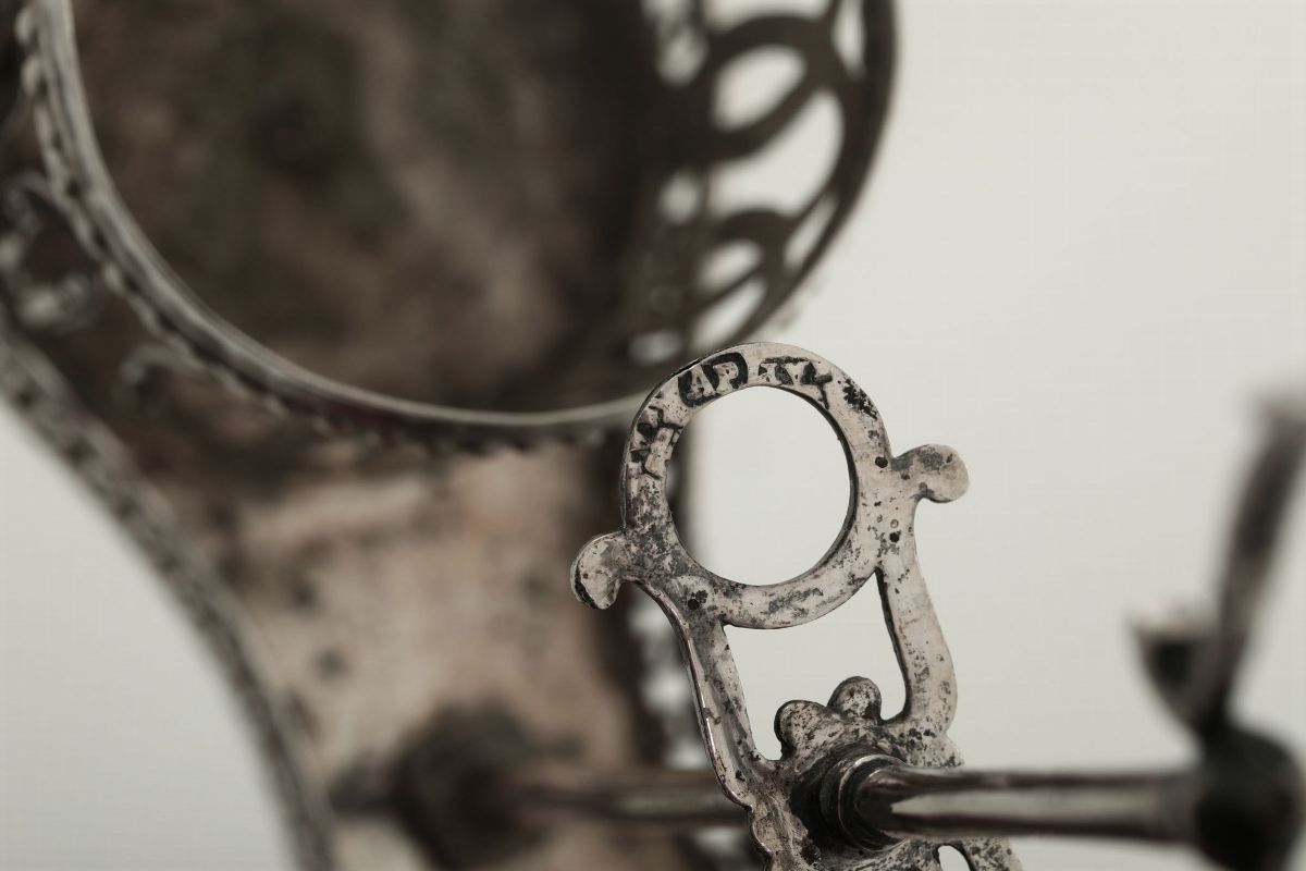Molten, embossed, chiselled and perforated silver. Guarantee stamp and unidentified silversmith's mark. 440gr, 26x22cm