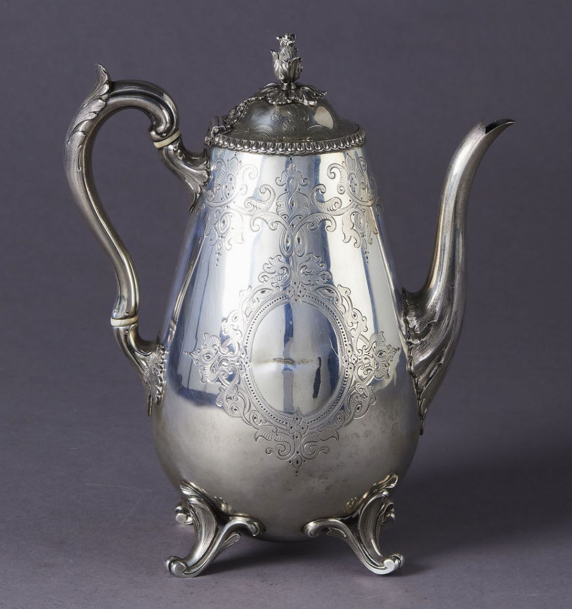 Caffettiera in argento fuso, sbalzato e cesellato, Londra 1863, argentiere E.K.R. (non identificato)