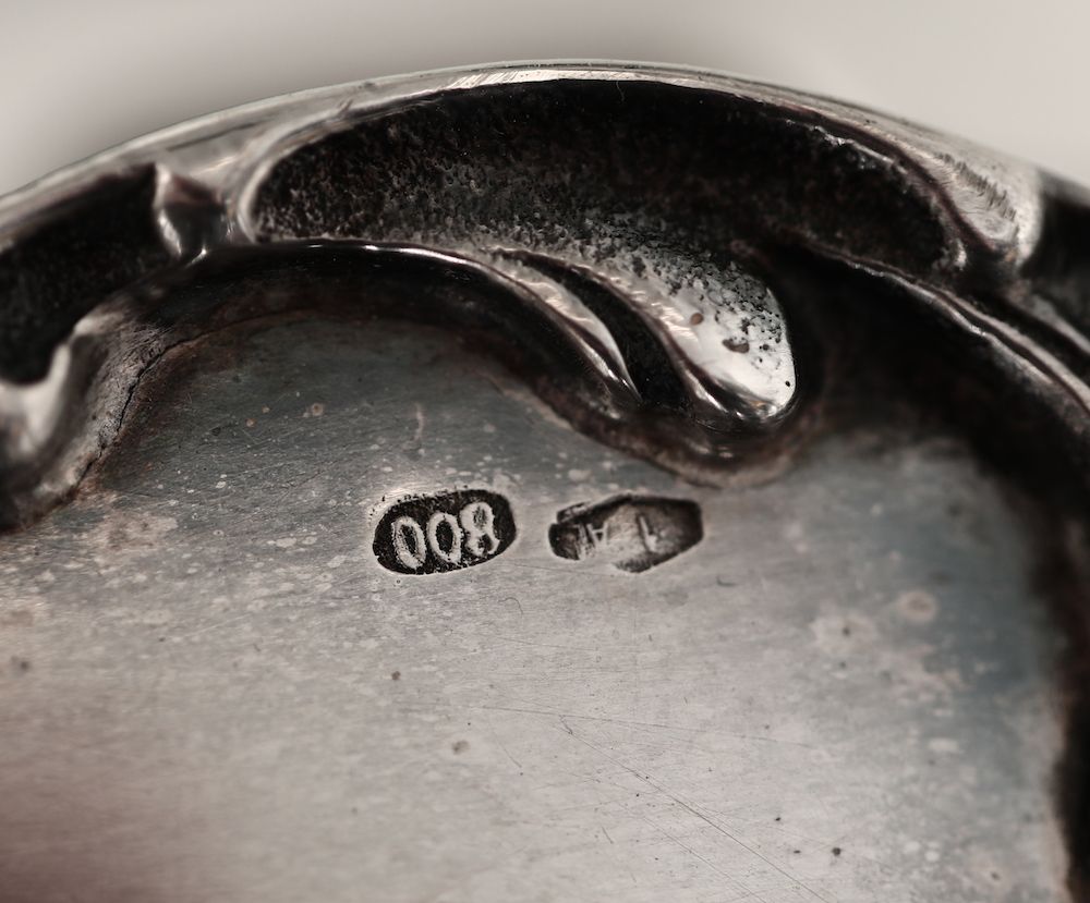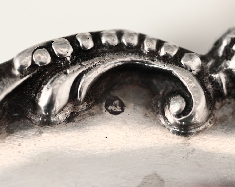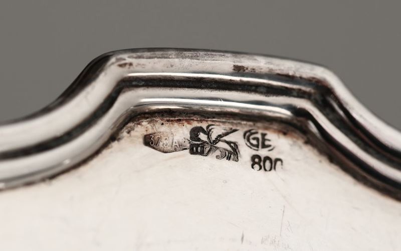 Bordi sagomati con volute, centrotavola diametro cm 34,5; piattini diametro cm 19, gr. 1900