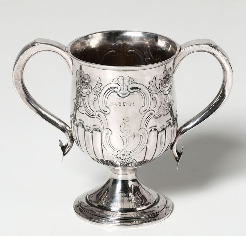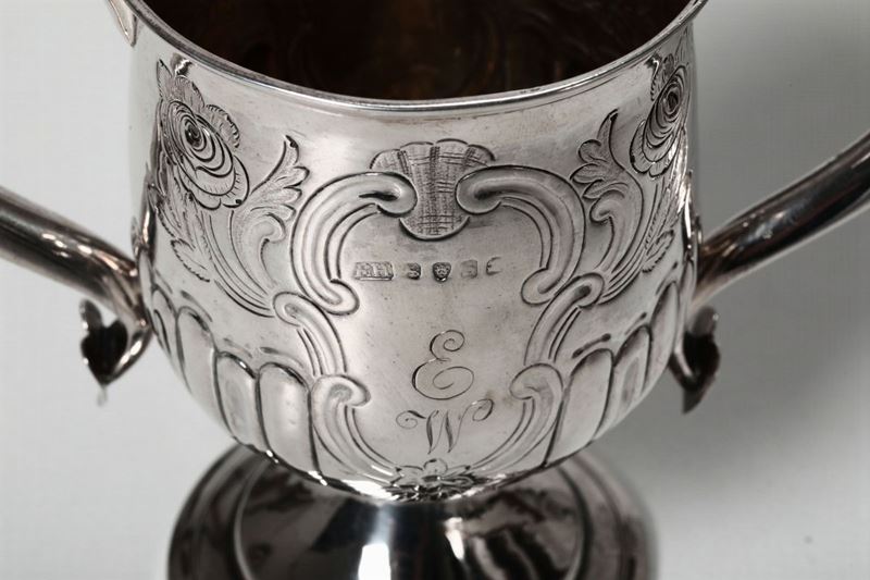 Coppa biansata in argento fuso, sbalzato e cesellato. Inghilterra prima metà XX secolo