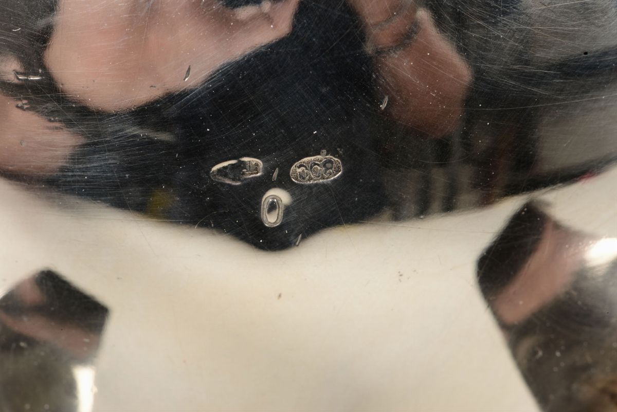 Servizio formato da 3 pezzi in argento in stile barocchetto e vassoio in metallo