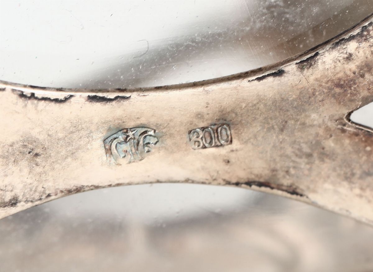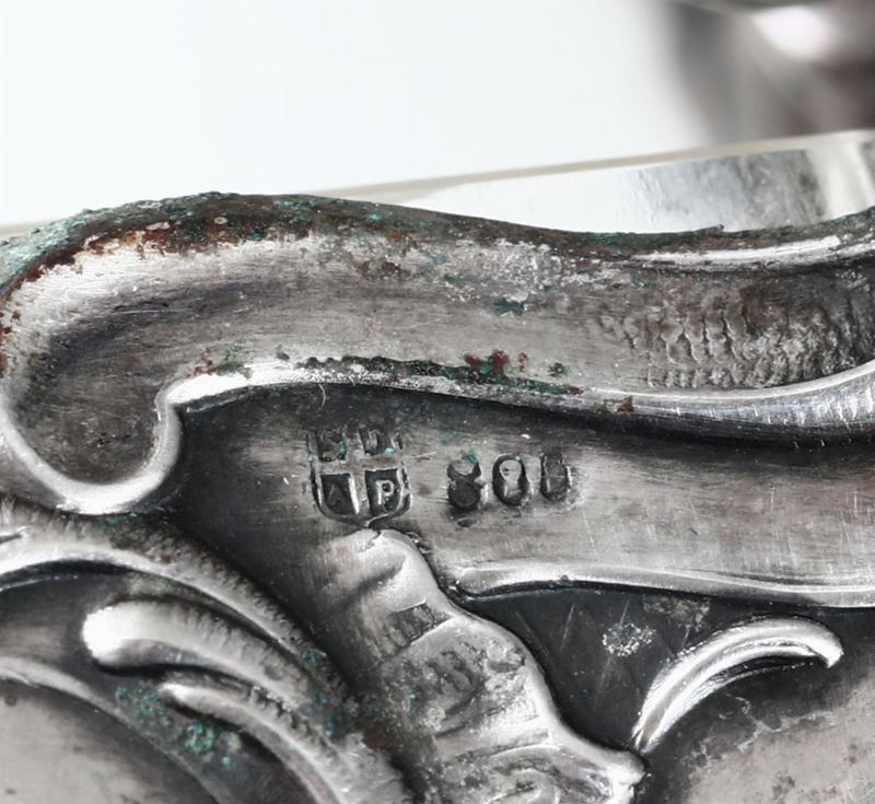 Set saliere e formaggiere in argento e vetro. Argenteria artistica italiana, inizi XX secolo