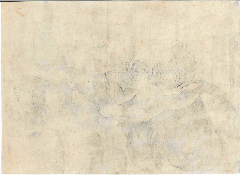 La prova, nitida e con tonalità argentee, nel I stato di 2 prima dell'edizione del Salamanca, è impressa su carta avente filigrana Ancora nel cerchio databile verso il 1525 e il 1527. Tratta da un'incisione di Marcantonio Raimondi, l'opera ha all'origine un disegno di Giulio Romano. Bibliografia: Bartsch, nn. 482; Raphael Invenit, pp. 268-269; Filigrana: Briquet, n. 471
