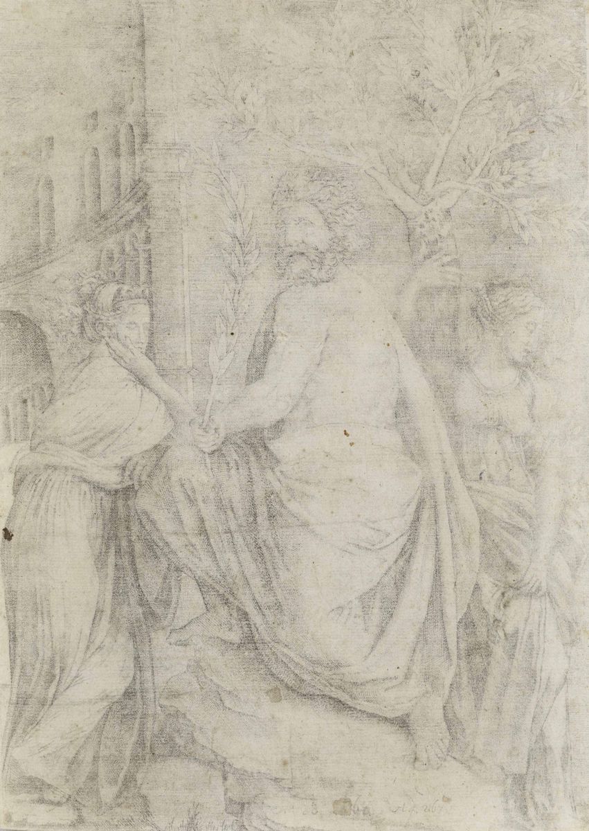 La prova, monogrammata sulla tavoletta, nitida e ben contrastata, nell'unico stato conosciuto, è impressa su carta avente filigrana Cerchio con tre monti con croce, databile verso il 1515/1527. L'iconografia è ispirata ad un'invenzione raffaellesca. Bibliografia: Bartsch, n. 491; Filigrana: Briquet, n. 11912