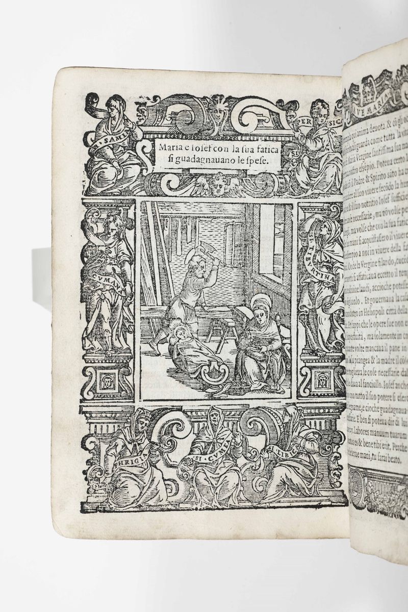 In-8°. Legatura coeva in pergamena floscia. Manca la carta S8 e l'ultima. Fascicoli allentati. Macchia al piede delle prime carte. Esemplare scompleto di questo bellissimo figurato cinquecentesco, adorno di decine di incisioni in legno che illustrano episodi della vita di Gesù, entro elaborate bordure xilografiche.
