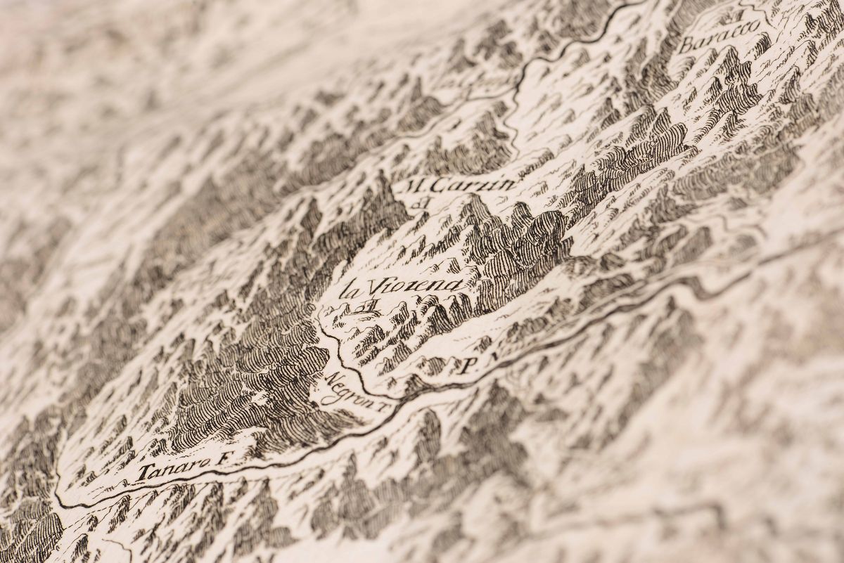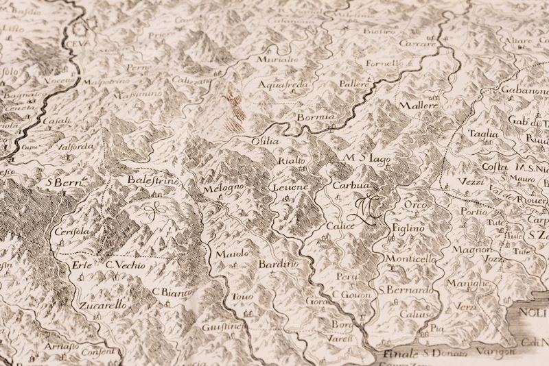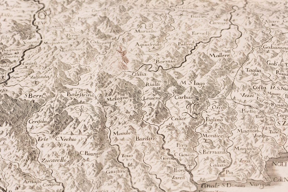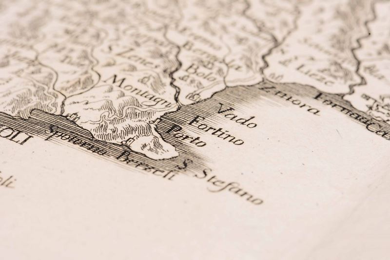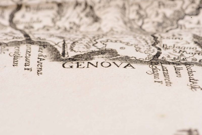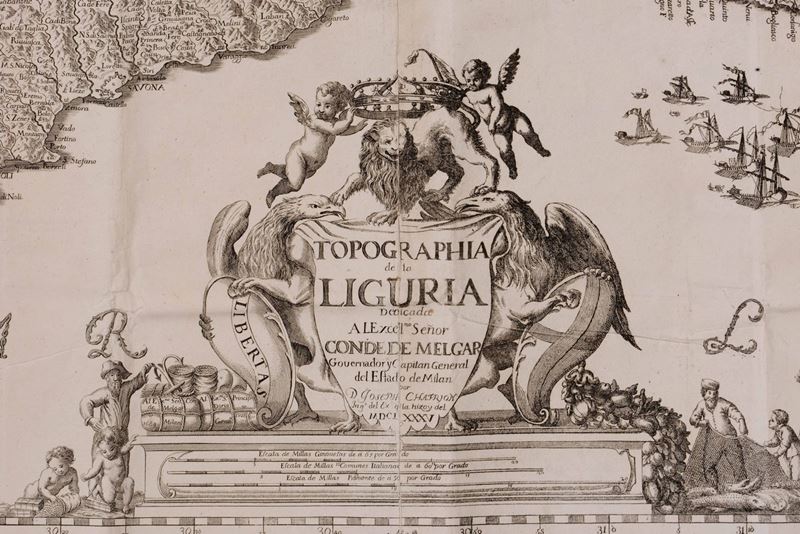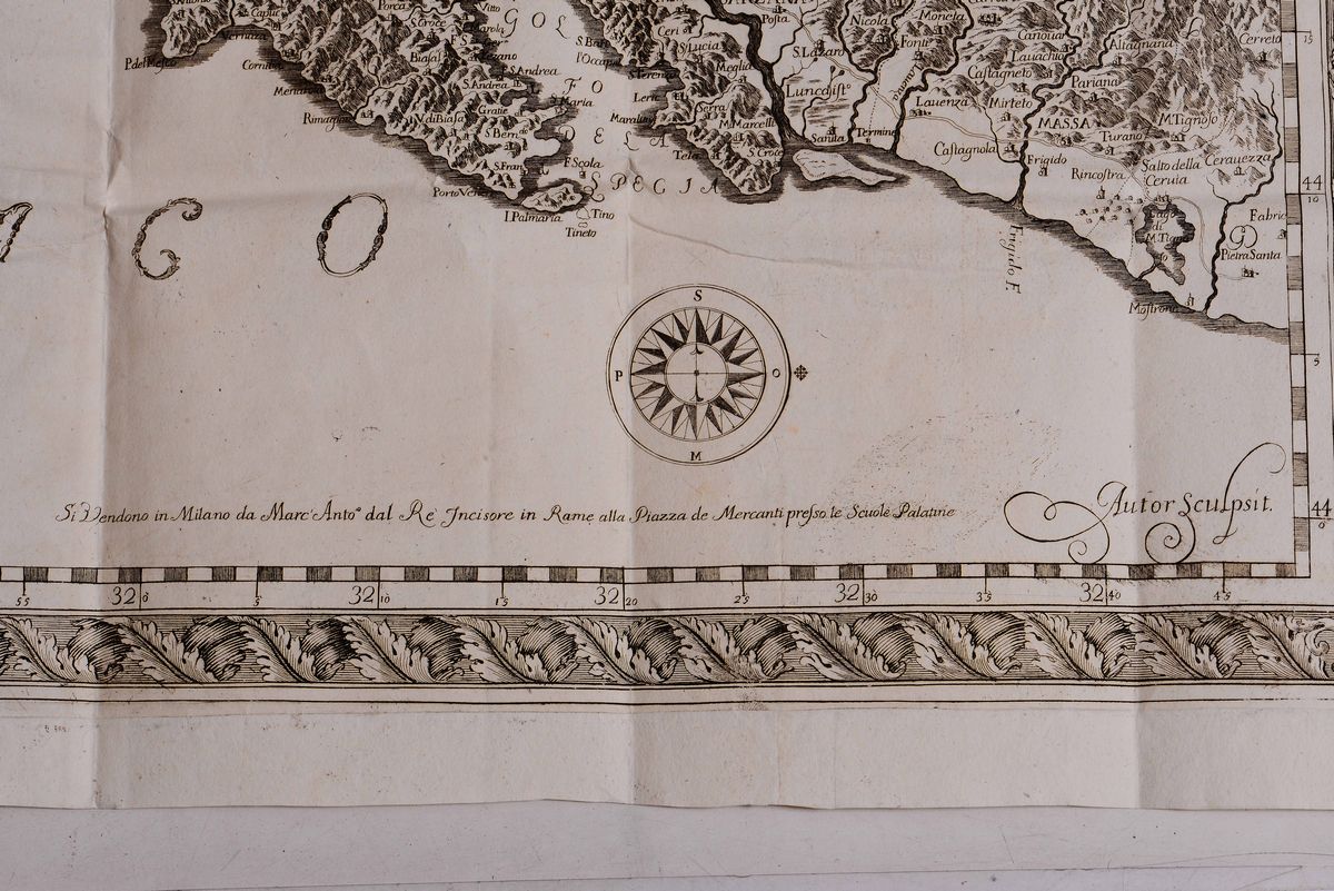 Mn. 1950 x 890 circa. Grande incisione in rame più volte ripiegata, che si compone di otto fogli uniti tra loro. Prima edizione di quella che é considerata da molti autorevoli studiosi la più importante carta murale della Liguria. Comprende la costa da Nizza alla Versilia e tutto l'entroterra da Torino a Parma. Fu realizzata per opera del cartografo e matematico valenciano, Joseph Chaffrion, che lavorò a Genova come cartografo militare e incisore. La nostra carta reca la dicitura Si vende in Milano da Marcantonio Dal Re, incisore in rame alla Piazza dei Mercanti, presso le scuole palatine. Esemplare in buona conservazione, fatta eccezione per qualche piccolo strappo, facilmente riparabile, in corrispondenza della piegatura. Per approfondimento si rimanda alla lettura di Ferro, Gaetano-La Liguria nelle carte e nelle vedute antiche.De Agostini,1992.