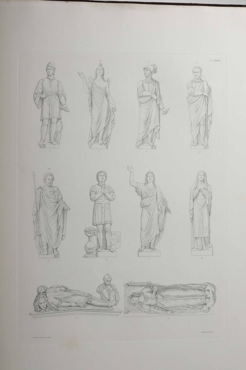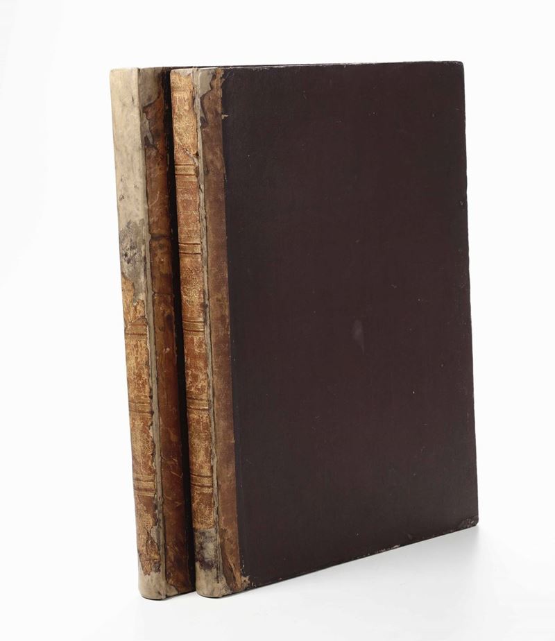 In-folio. Legature coeve in mezza pelle. Abrasioni e altri difetti. Alcune fioriture. Sguardie sostituite. Rottura ad una cerniera interna. Un volume di testo e uno di tavole. Ex libris a timbro al primo foglio bianco.