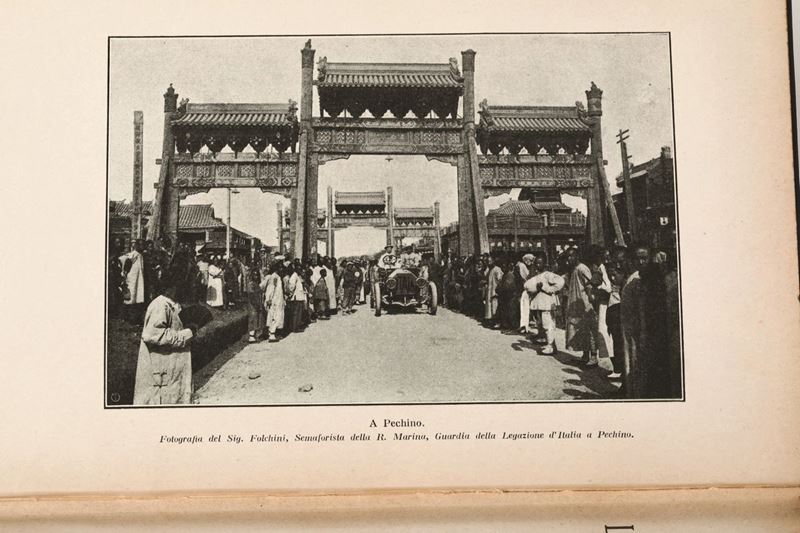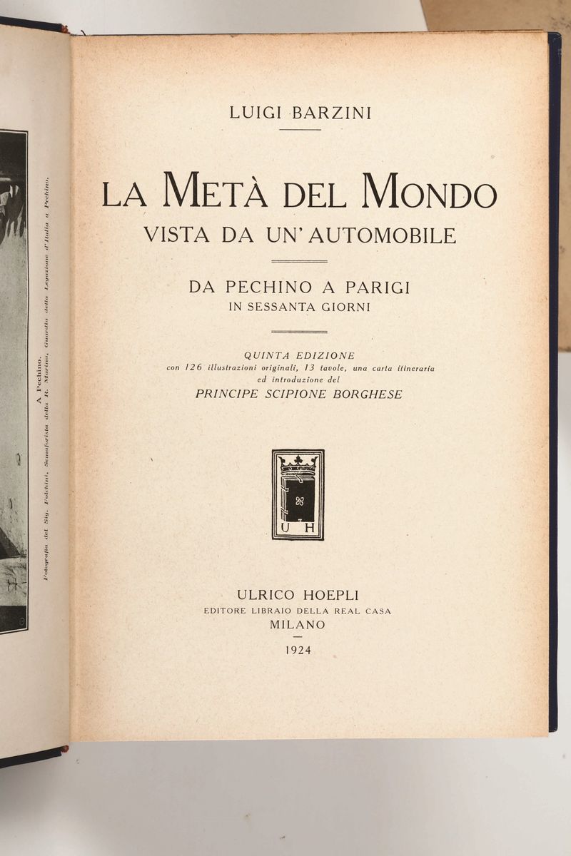 In-4°. Legatura in cartone muto, con tassello editoriale applicato al dorso. Bella edizione illustrata. (Si unisce nel lotto:) Barzini, Luigi. La metà del mondo vista da una automobile. Milano, Hoepli, 1924. Quinta edizione.