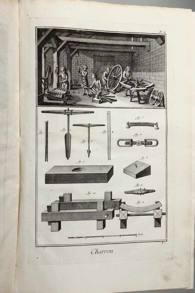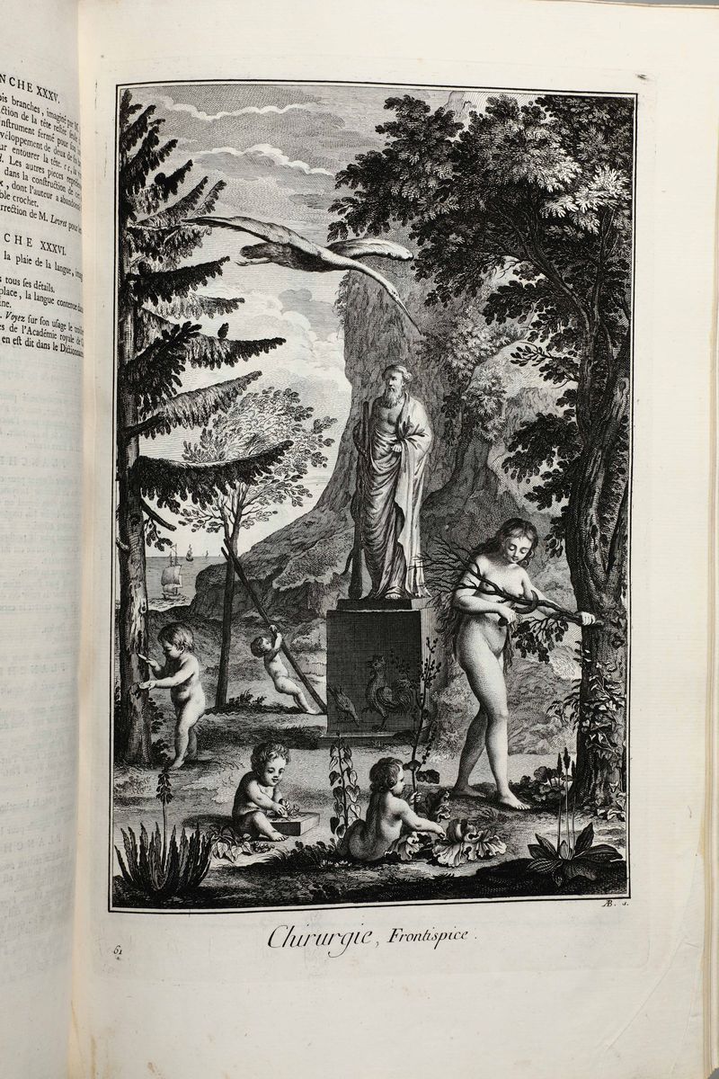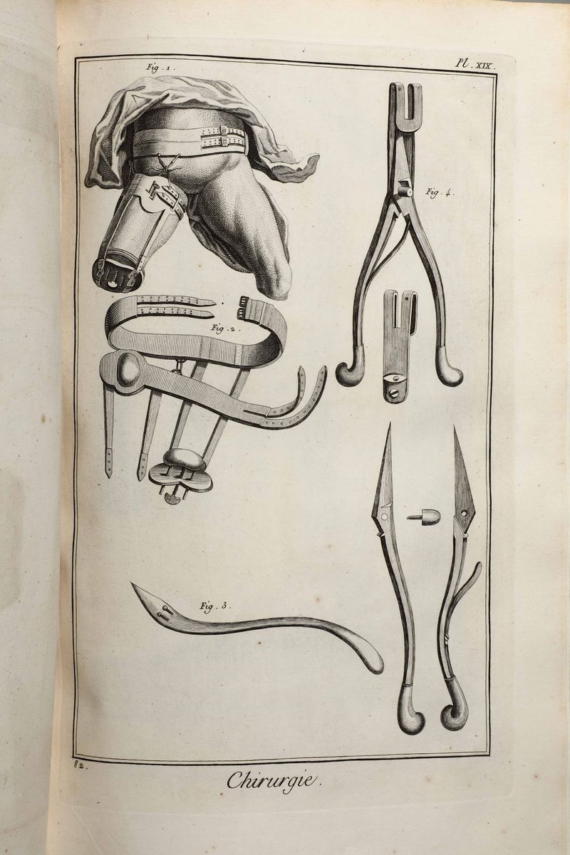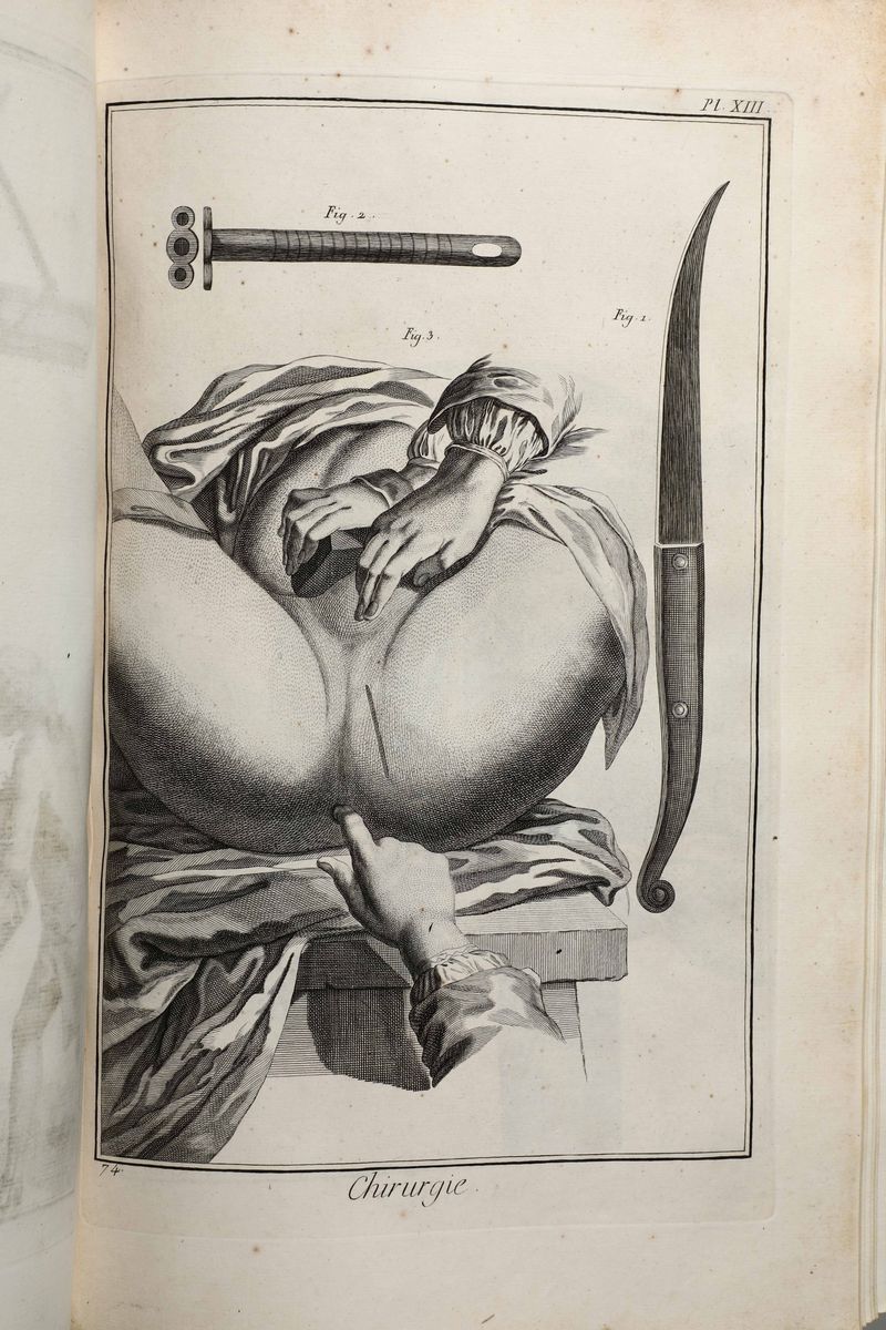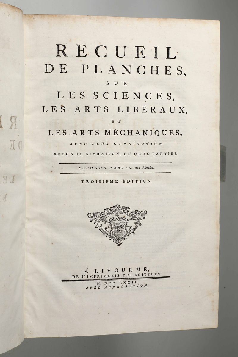 In-Folio. Edizione composta all'origine da volumi dell'edizione di Livorno per la più parte e da alcuni volumi di Parigi,Edizione Panckoucke. Legatura coeva uniforme in piena pergamena rigida. Si compone di 33 volumi.17 volumi di testo,12 volumi di plances e 4 volumi di supplemento. Buon esemplare genuino tuttavia non esente da bruniture e gore da umidità.Opera straordinaria e monumento su cui si basa buona parte della cultura di radice illuminista, che ha contraddistinto il secolo della borghesia e tutto il '900. Corredata da un imponente apparato illustrativo,composto da oltre 2700 tavole incise in rame,molte delle quali a doppia pagina.