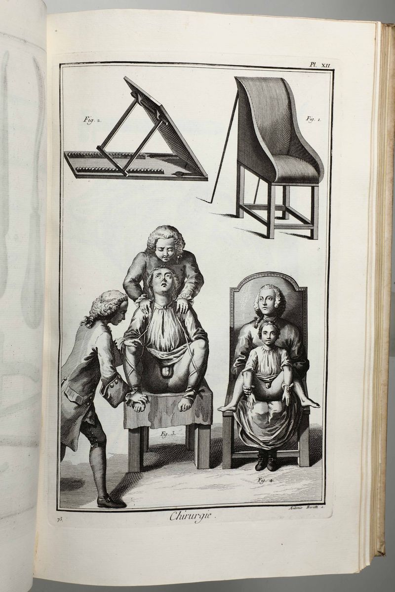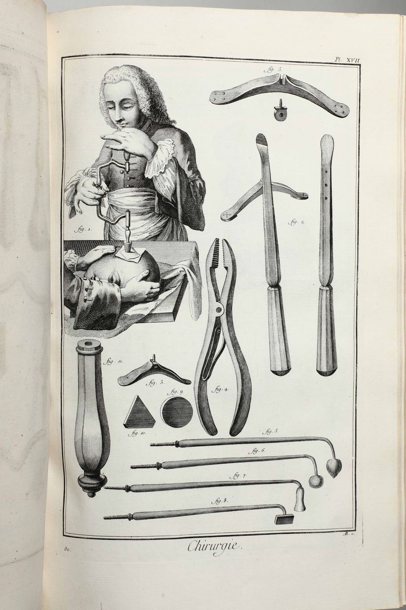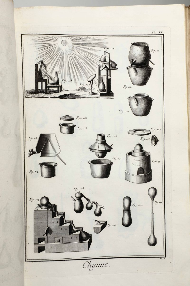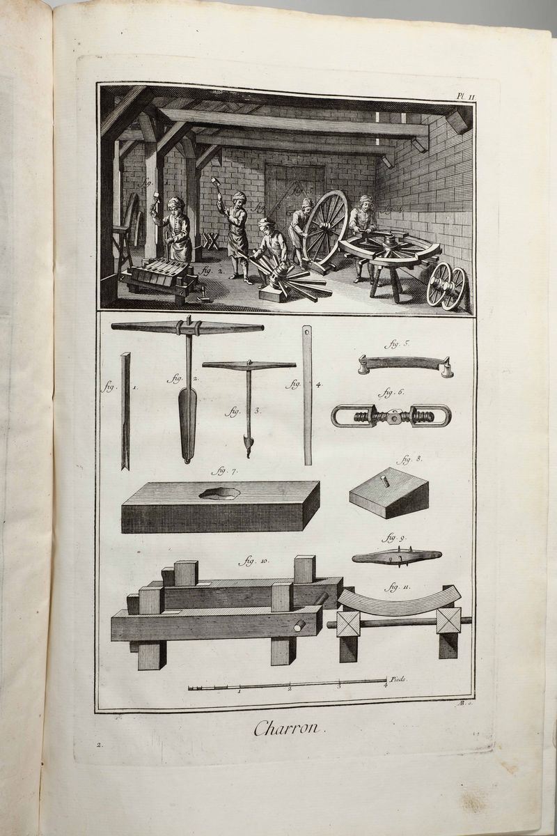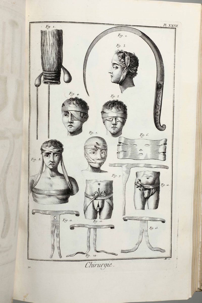 In-Folio. Edizione composta all'origine da volumi dell'edizione di Livorno per la più parte e da alcuni volumi di Parigi,Edizione Panckoucke. Legatura coeva uniforme in piena pergamena rigida. Si compone di 33 volumi.17 volumi di testo,12 volumi di plances e 4 volumi di supplemento. Buon esemplare genuino tuttavia non esente da bruniture e gore da umidità.Opera straordinaria e monumento su cui si basa buona parte della cultura di radice illuminista, che ha contraddistinto il secolo della borghesia e tutto il '900. Corredata da un imponente apparato illustrativo,composto da oltre 2700 tavole incise in rame,molte delle quali a doppia pagina.