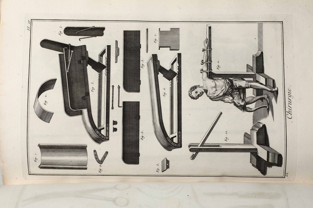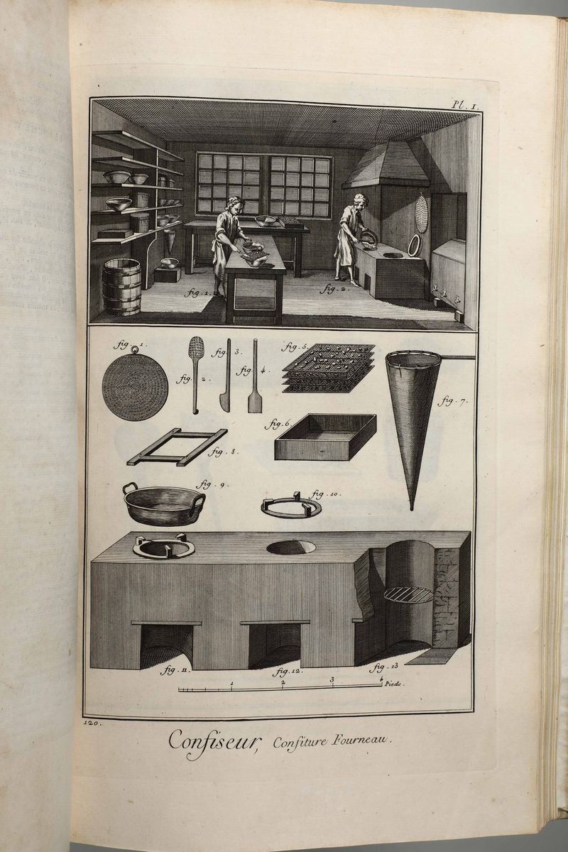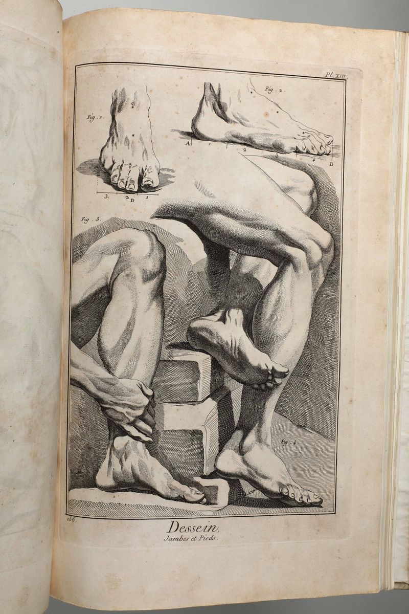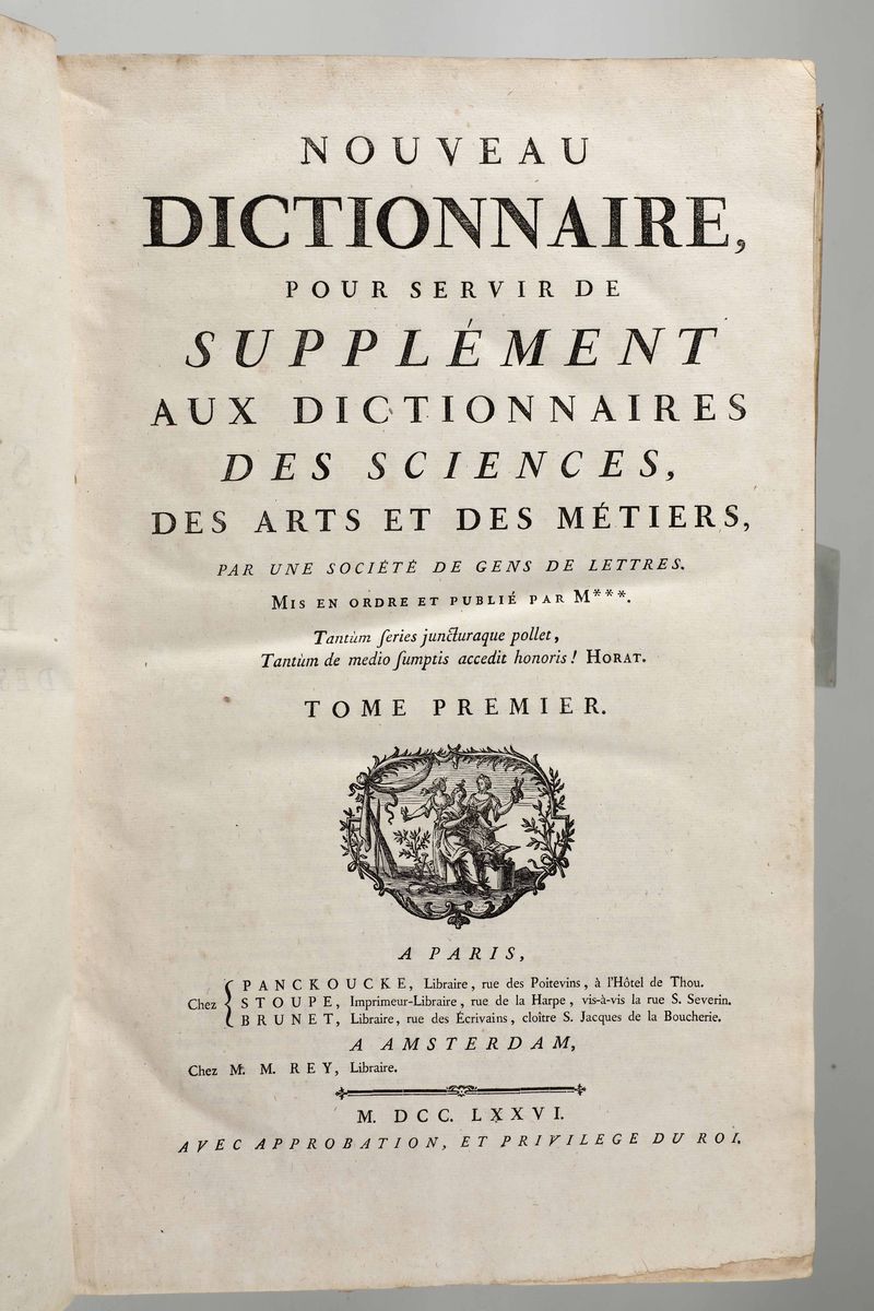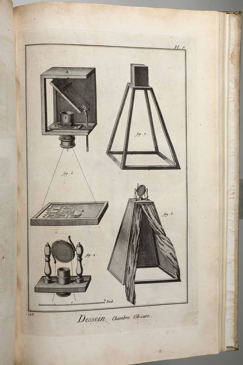 In-Folio. Edizione composta all'origine da volumi dell'edizione di Livorno per la più parte e da alcuni volumi di Parigi,Edizione Panckoucke. Legatura coeva uniforme in piena pergamena rigida. Si compone di 33 volumi.17 volumi di testo,12 volumi di plances e 4 volumi di supplemento. Buon esemplare genuino tuttavia non esente da bruniture e gore da umidità.Opera straordinaria e monumento su cui si basa buona parte della cultura di radice illuminista, che ha contraddistinto il secolo della borghesia e tutto il '900. Corredata da un imponente apparato illustrativo,composto da oltre 2700 tavole incise in rame,molte delle quali a doppia pagina.