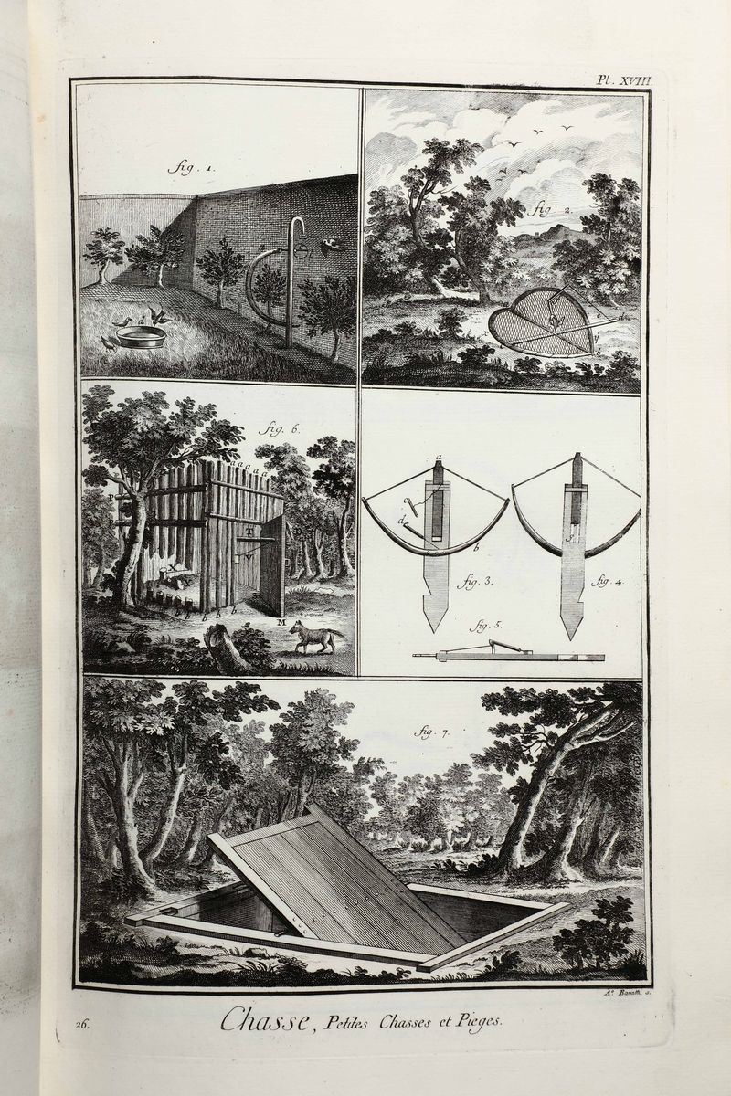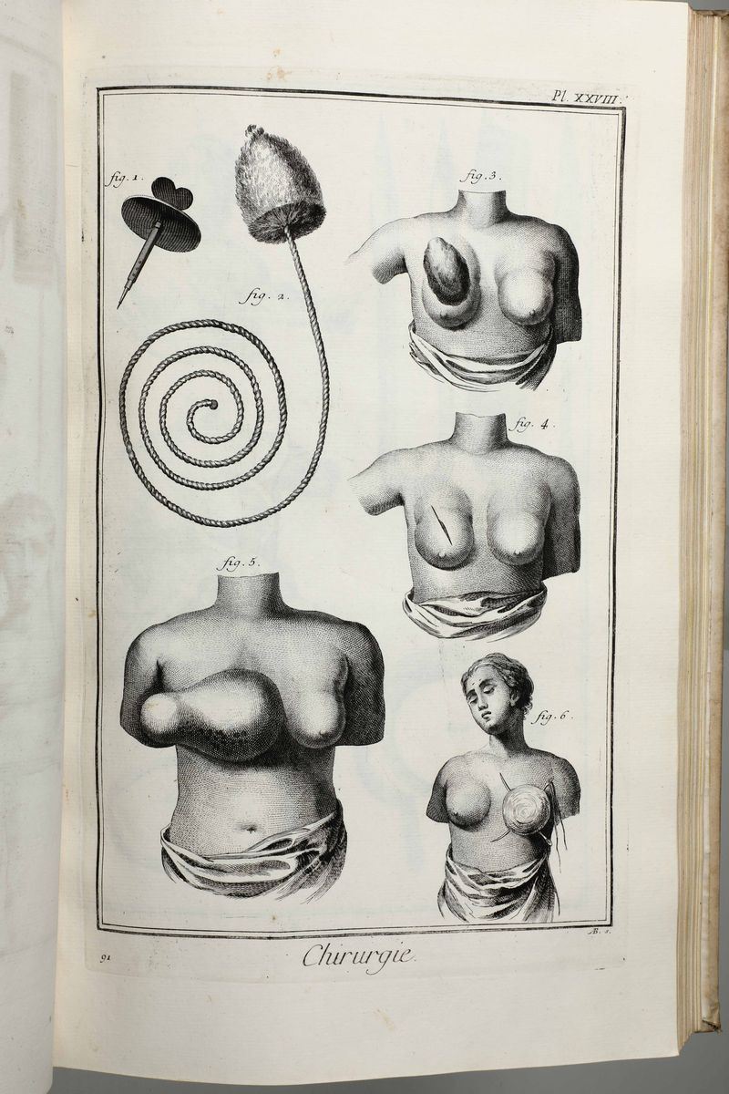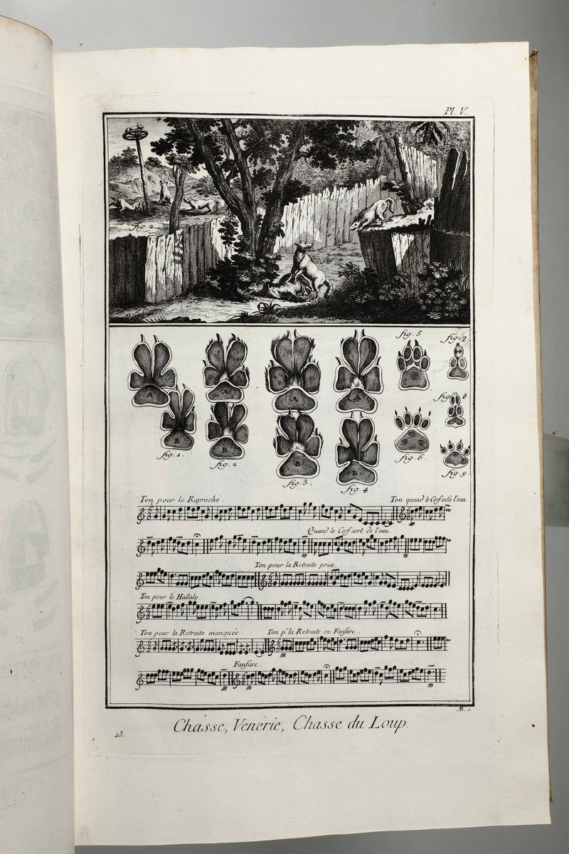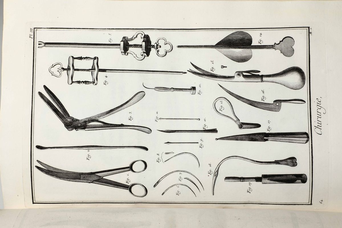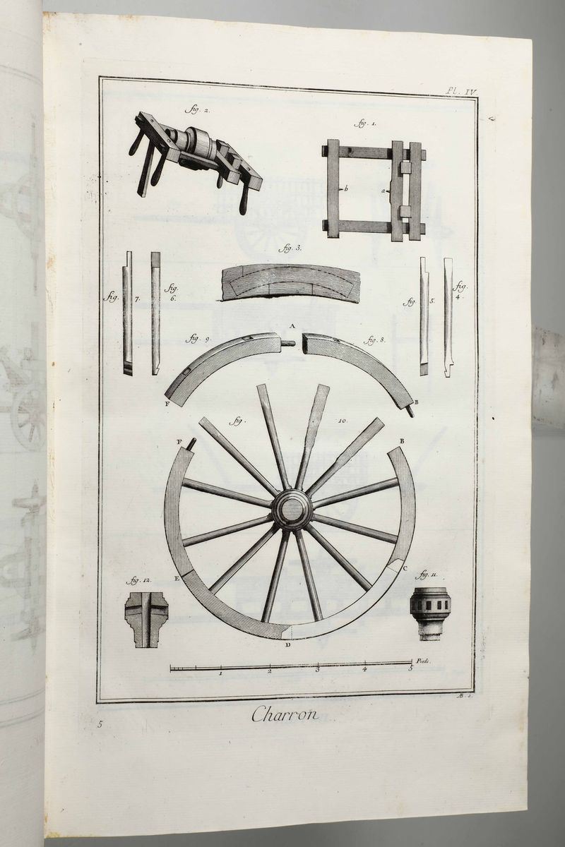 In-Folio. Edizione composta all'origine da volumi dell'edizione di Livorno per la più parte e da alcuni volumi di Parigi,Edizione Panckoucke. Legatura coeva uniforme in piena pergamena rigida. Si compone di 33 volumi.17 volumi di testo,12 volumi di plances e 4 volumi di supplemento. Buon esemplare genuino tuttavia non esente da bruniture e gore da umidità.Opera straordinaria e monumento su cui si basa buona parte della cultura di radice illuminista, che ha contraddistinto il secolo della borghesia e tutto il '900. Corredata da un imponente apparato illustrativo,composto da oltre 2700 tavole incise in rame,molte delle quali a doppia pagina.