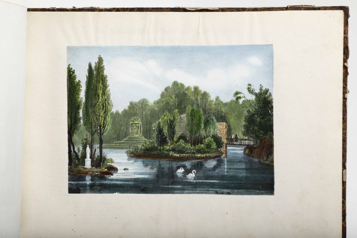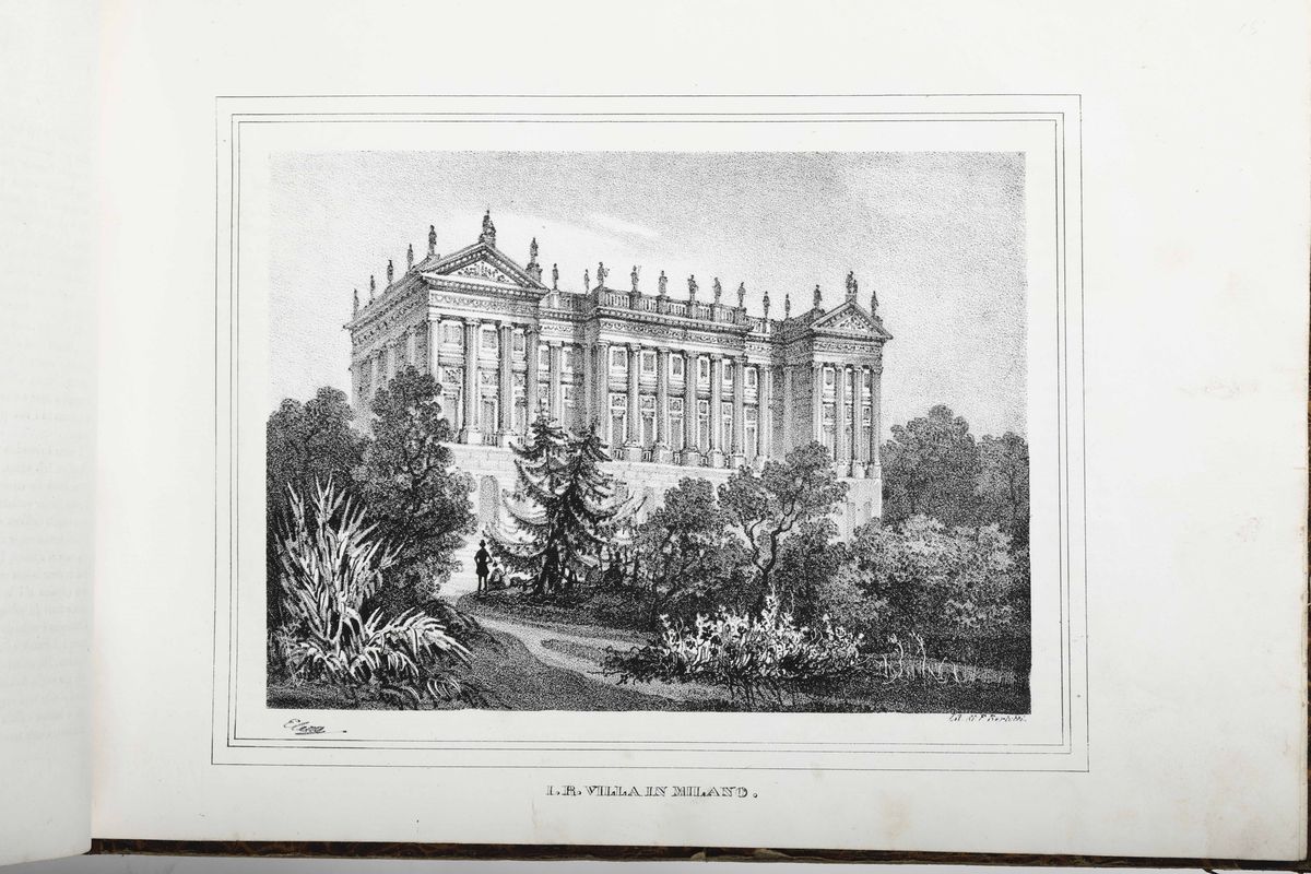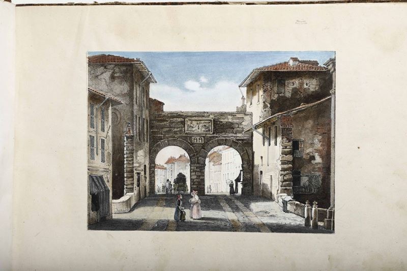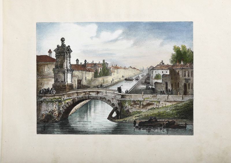 In-4° oblungo. Legatura coeva in mezza pelle. Album contenente le vedute del milanese, del bergamasco e della Valtellina. Decine di litografie a colori di bella fattura, alcune in nero.