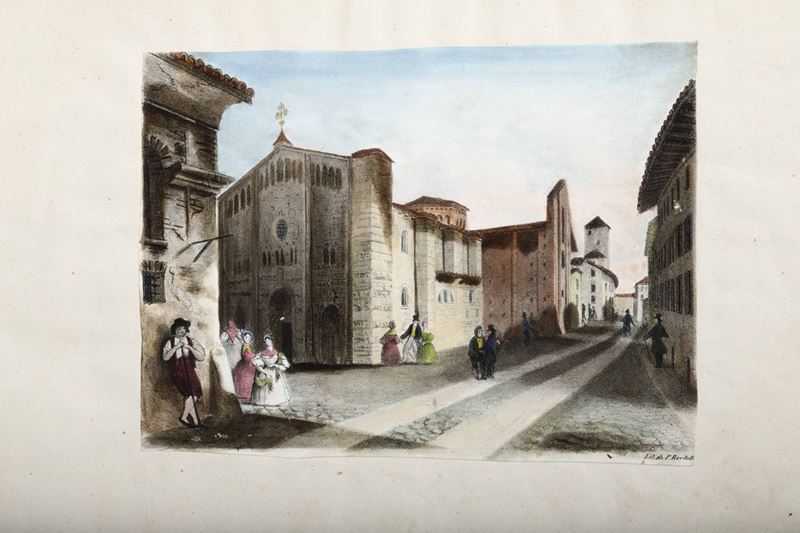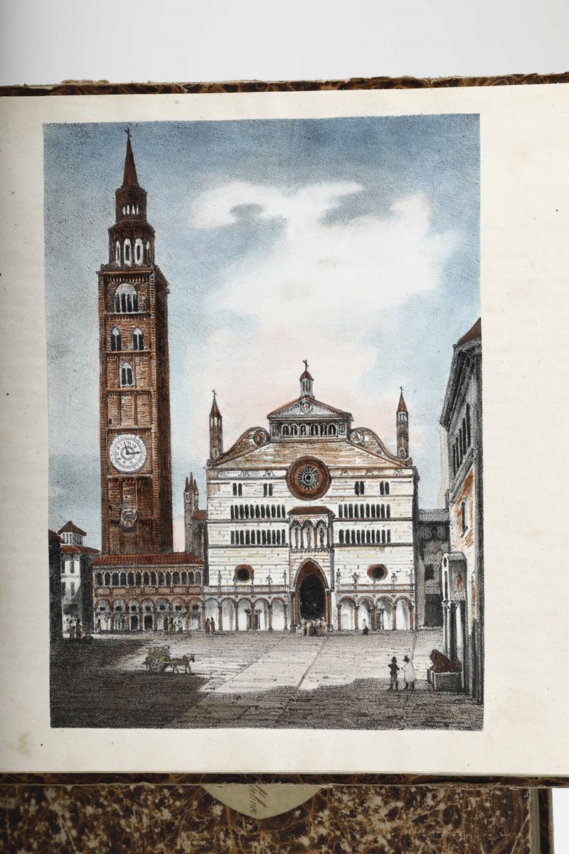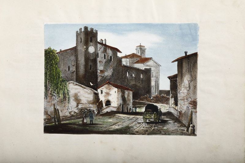 In-4° oblungo. Legatura coeva in mezza pelle. Bella raccolta di litografie a colori che riguardano Mantova, il ticino e il lodigiano.
