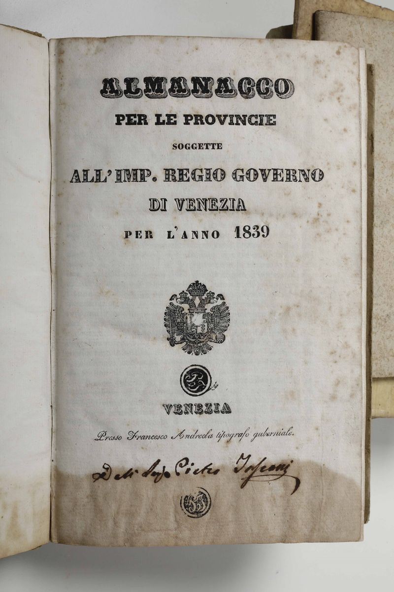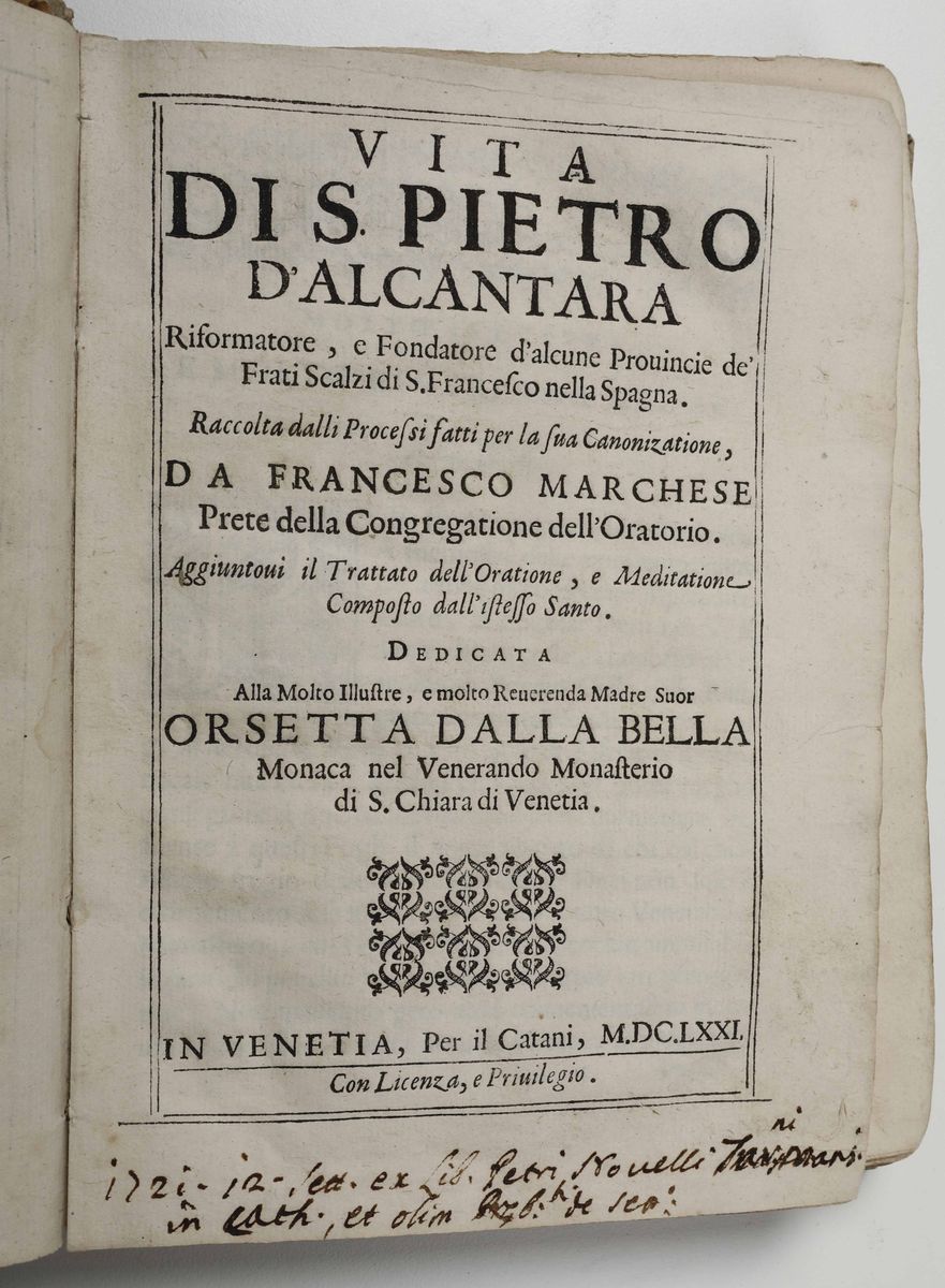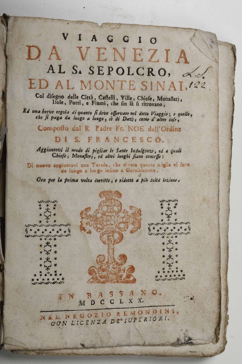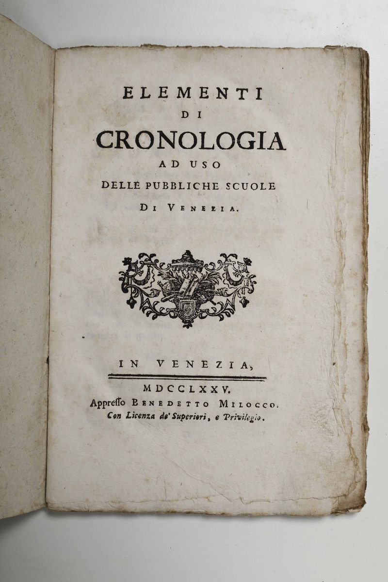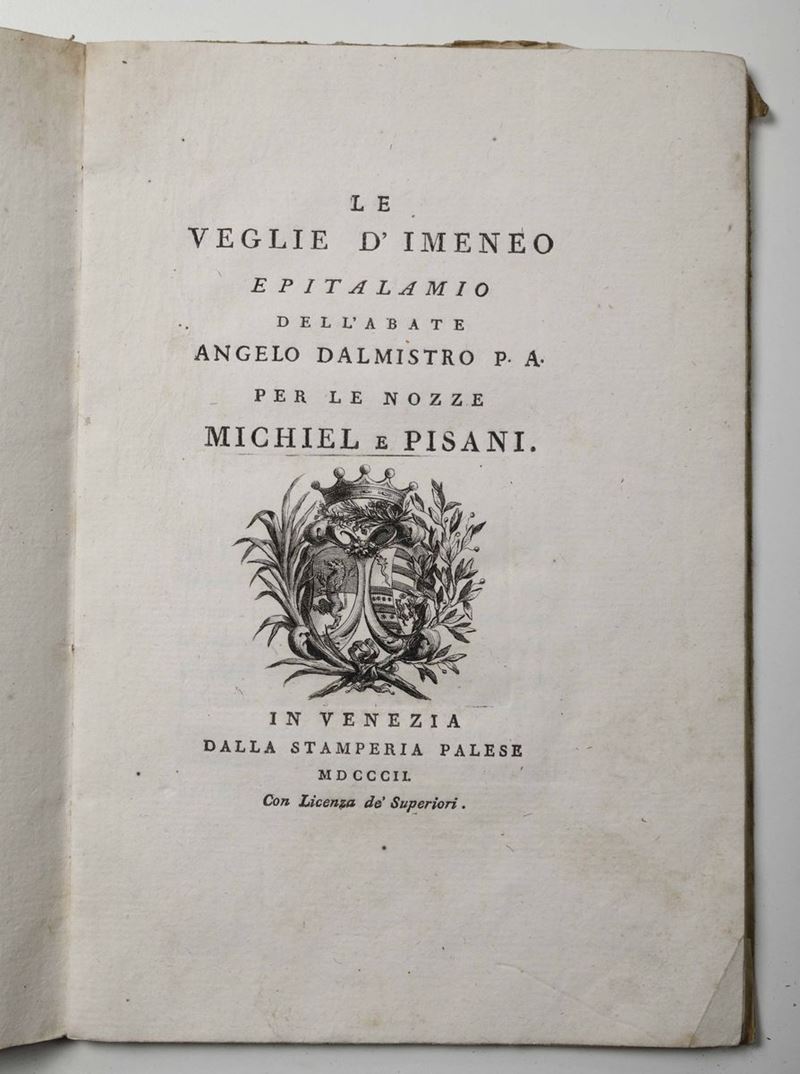 In-8°. Cartoncino azzurro coevo. Ritratto inciso in antiporta. (Insieme nel lotto:) Noe.Viaggio da Venezia al S. Sepolcro..Bassano,Remondini,1770./ Marchese, Francesco - Vita di San Pietro D'Alcantara..Venezia, Catani,1671. / Almanacco per l'anno 1839- Venezia,Andreola,1839. / Elementi di Cronologia.. Venezia, Milocco,1775. / D'Almistro, Angelo-Le Veglie d'Imeneo,1802. Tutte le rilegature sono in cartoncino o cartonato coevo. (Sei libri nel lotto). Bruniture, strappi e piccoli difetti.