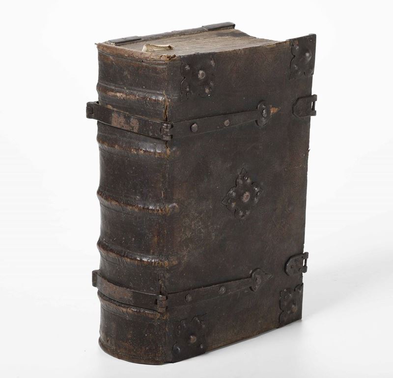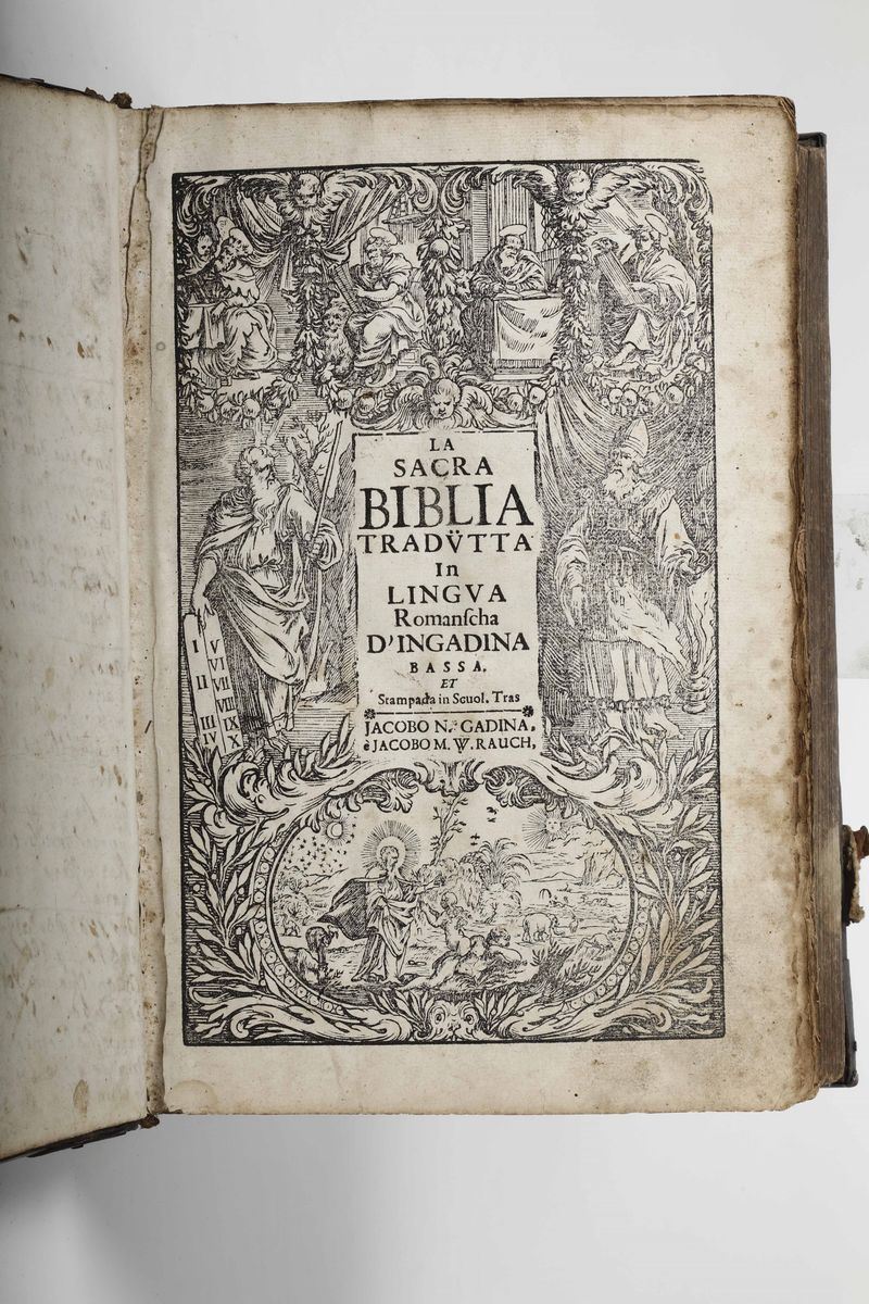 In-folio. Bella legatura coeva in piena pelle con borchie metalliche e angolari. Mancano i lacci di chiusura. Affascinante esemplare, anche per la bella legatura che la protegge di questo volgarizzamento della Bibbia in lingua della bassa Ingadina.