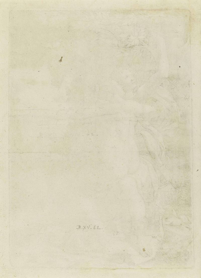 La prova, nitida e ben contrastata nel III stato di 4 dopo la cancellazione del nome dello stampatore Lafreri, è impressa su carta avente filigrana Aquila nel Cerchio Coronato, databile verso il 1573 e il 1576. Il soggetto si ispira ad un disegno di Teodoro Ghisi (1536/1601), pensato per una delle prime illustrazioni dell'Orlando Furioso. Bibliografia: Bartsch, n. 62; Lewis, n. 43; Massari, Incisori mantovani, n. 205; Filigrana: Lewis, n. 13; Briquet, n. 207