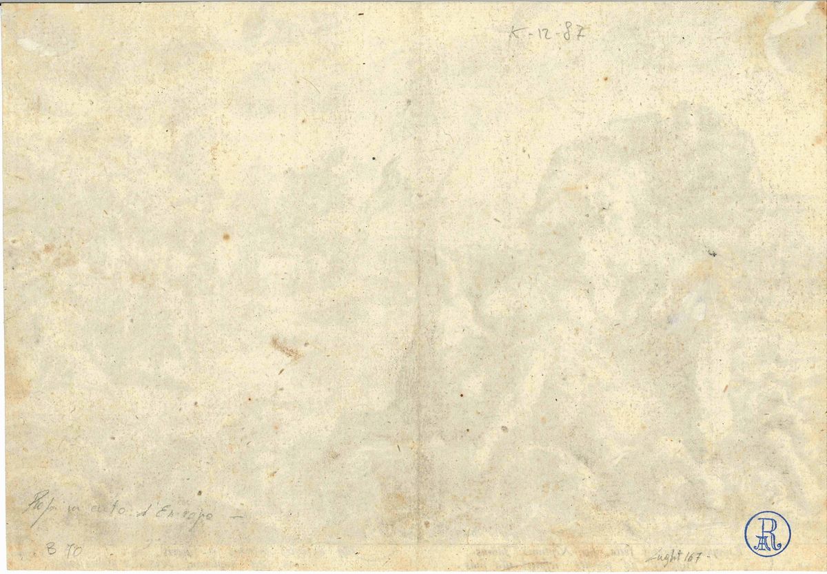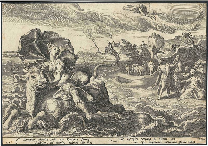 La prova, impressa su carta avente filigrana con Aquila, tipicamente in uso in Olanda nel tardo Cinquecento, appartiene alla serie di 52 stampe che illustrano le Metamorfosi di Ovidio, disegnate da Goltzius nel 1589-1590, eseguite sotto la sua direzione e stampate ad Amsterdam da Robert de Baudons. Al verso del foglio è apposto il marchio di collezione A. Riedinger, ricco industriale di Augsburg, che nella seconda metà dell'Ottocento allestì un autentico gabinetto di stampe composto da quasi duemila fogli. La raccolta fu venduta ad un'asta a Monaco nel 1895. Bibliografia: Bartsch, III, p. 61, nn. 31-82; Bartsch, Illustrato, III, p. 332, n. 70; Hollstein, nn. 508-559; Lugt, n. 167