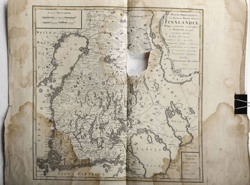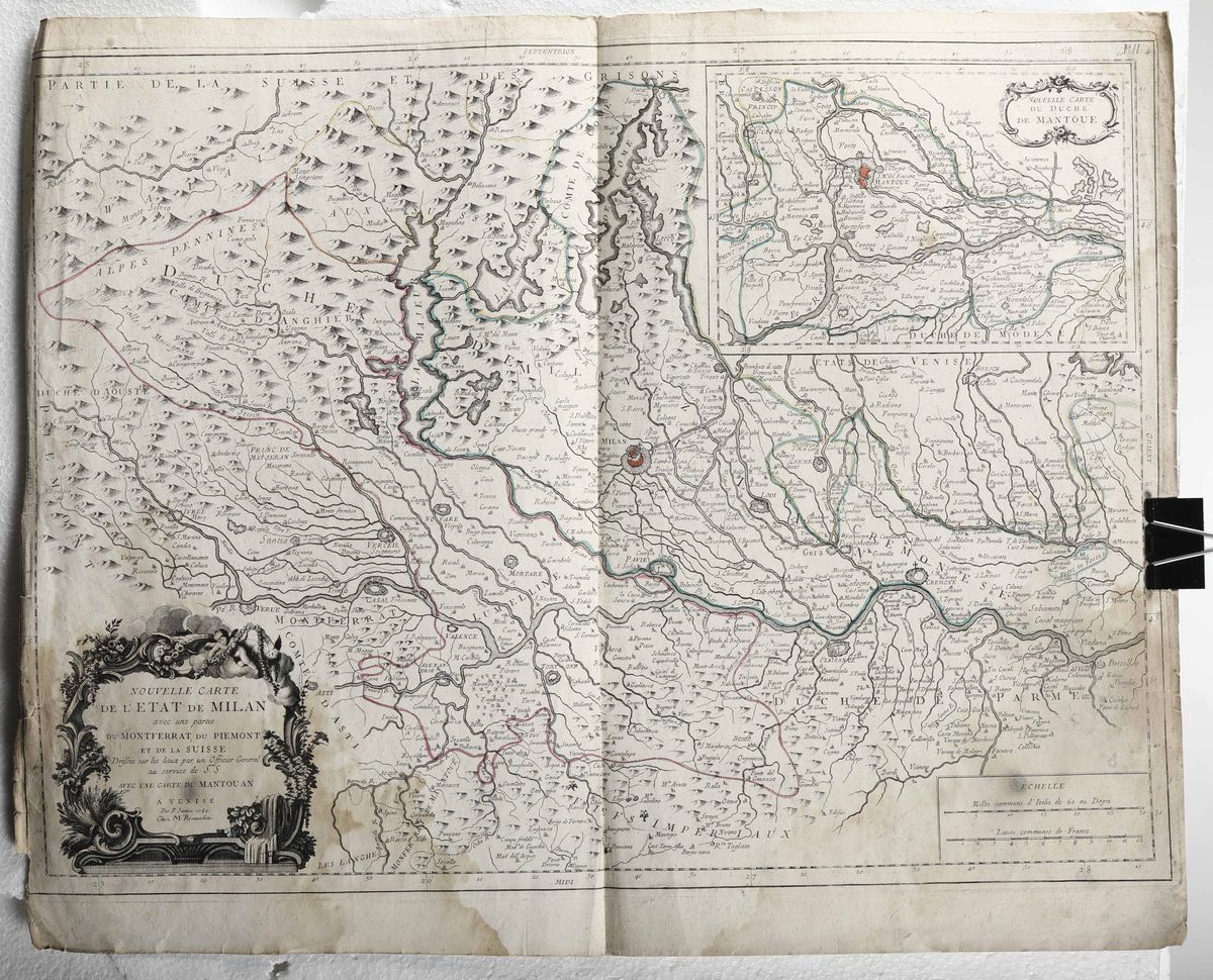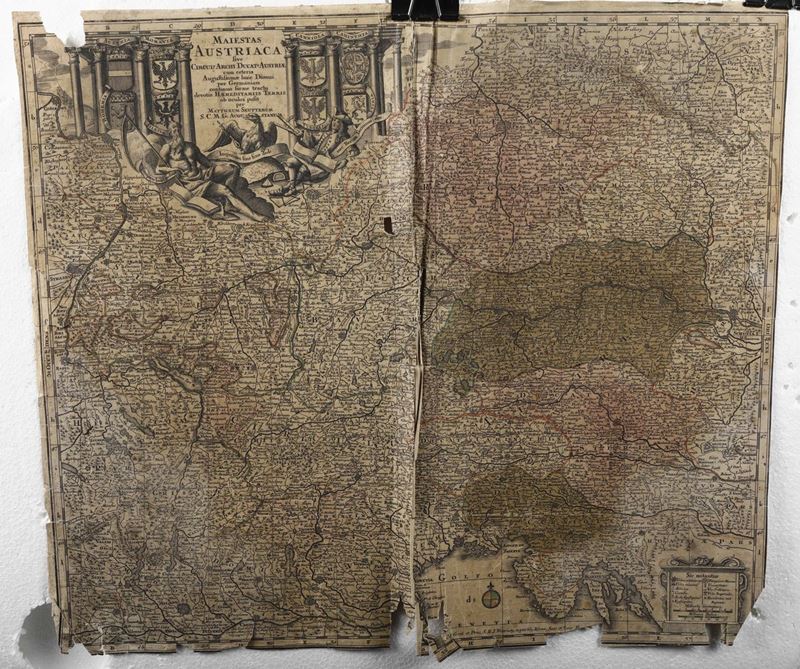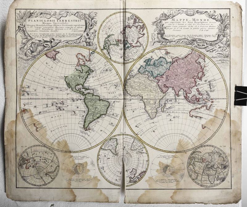 Cm. 53 x 60. Carte geografiche sciolte,settecentesche, tra cui un Mappamondo dell'Homann,1746,provenienti da diversi atlanti. Bruniture strappi e difetti.