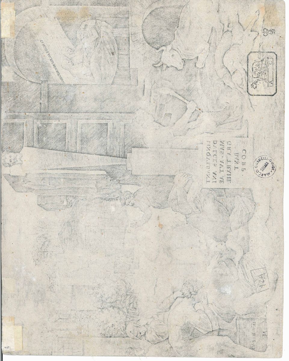 La prova, nitida e ben contrastata stampata con tonalità argentee, nel II stato di 4 prima dell'edizione di Salamanca, appare impressa su carta databile ai primi decenni del Cinquecento ed è tratta da un disegno di Raffaello conosciuto anche col nome La Peste di Frigia. Al verso sono presenti vari timbri di collezione, quello del Principe Sutzo (Parigi, 1800), A. Castagnari (Roma, prima metà del Novecento). Bibliografia: Bartsch, n. 417; Delaborde, n. 198; Bertelà, n. 441; Raphael Invenit, p. 233; Ex.coll. Lugt.: nn. 2341, 86a